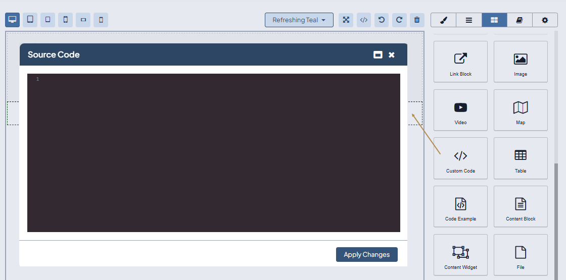 Drag the </> Custom Code block to the required place of your canvas.