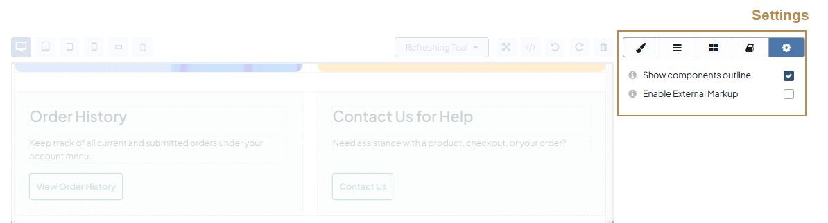 Settings — A group of settings that enable you to control the content outline and toggle the external markup mode. The external markup mode allows you to import a complex HTML code to the editor, preserving its formatting and styling.
