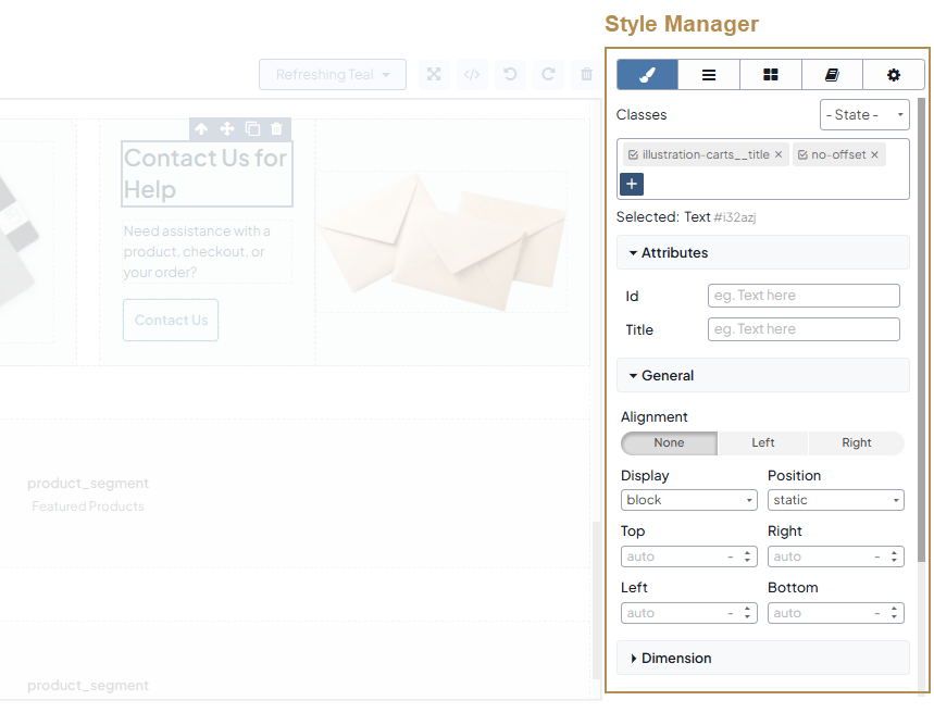 Style Manager — A group of settings that are used to customize the content blocks added to the canvas. Within the style manager, you can assign a selected CSS class to certain blocks, provided that the necessary class is specified in the file of css styles linked to the main website template. You can also set the alignment of the blocks against other content, set margins, paddings, fonts, and colors, scale and rotate the text, as well as apply other transformations to the selected content structure.