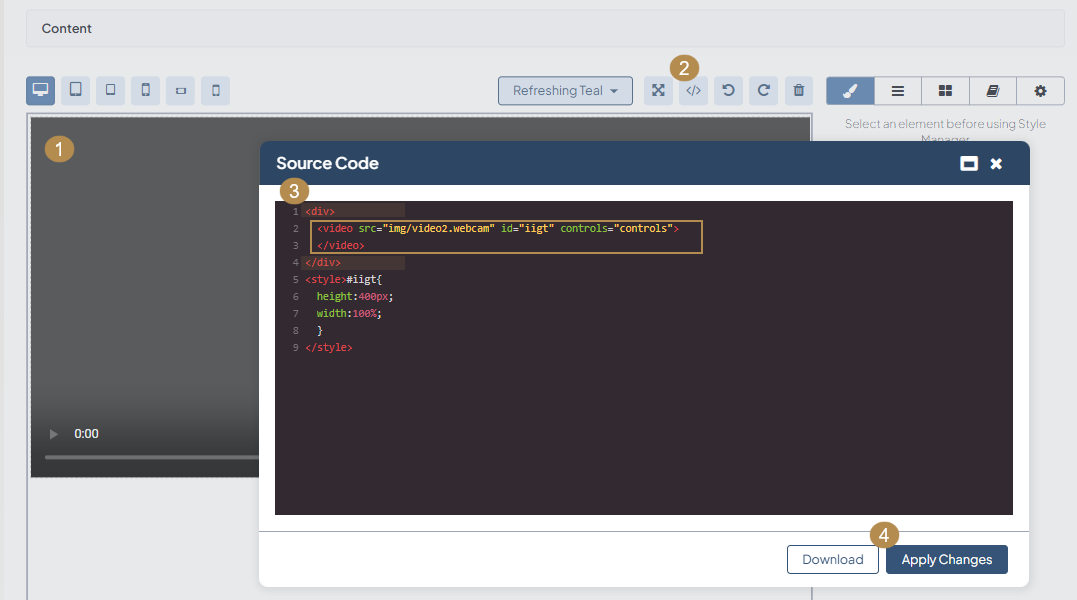 To embed YouTube or Vimeo URLs to your content, you need to drag the Video block to the canvas. Set the video provider (HTML5 Source, vimeo) in the Settings section under Style Manager and add the direct link to the Source field. The permissions to add videos depend on the restrictions set in the configuration file.