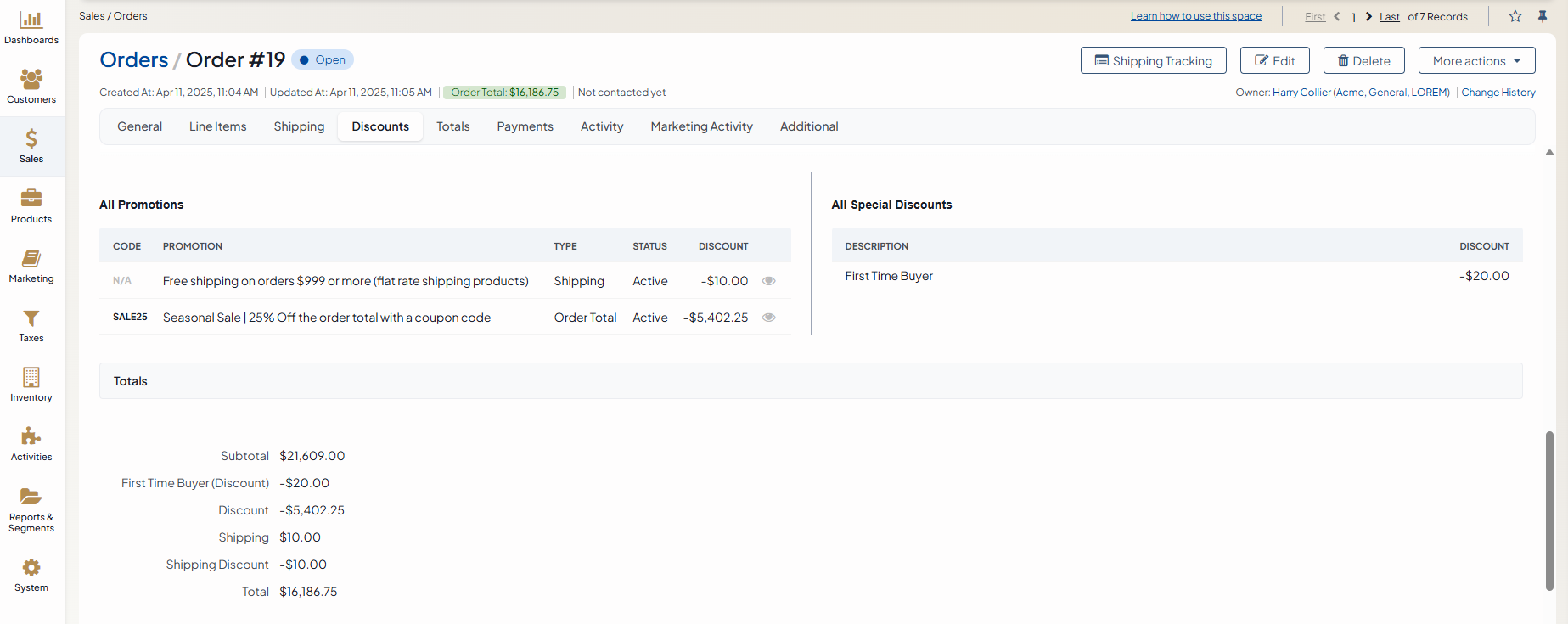 You can view discounts applied to a specific order under the dedicated Promotions and Discounts section on the order page. This section is divided into All Promotions and All Special Discounts. Within All Promotions, you can view promotions and coupon codes. Within All Special Discounts, you can view special discounts added manually. When items in the order qualify for multiple discounts, several promotions or coupon codes can be added to it. The only limitation of this capability is that you cannot use two coupon codes for one order if they are part of the same promotion.