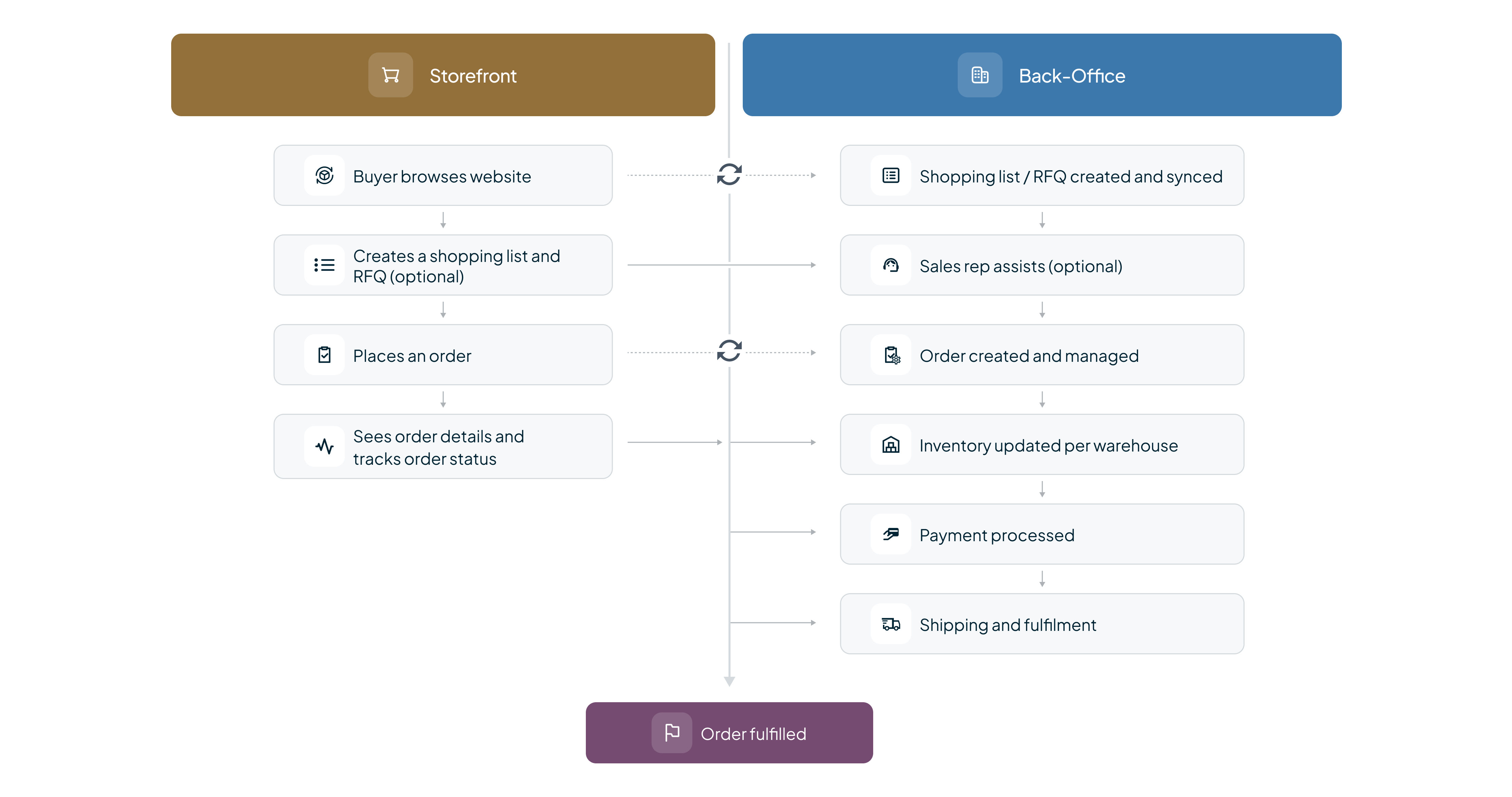 Orders can be placed both by customers through the storefront (SF), and by their sales reps through the back-office (BO). In the storefront, an order starts from a shopping list.
