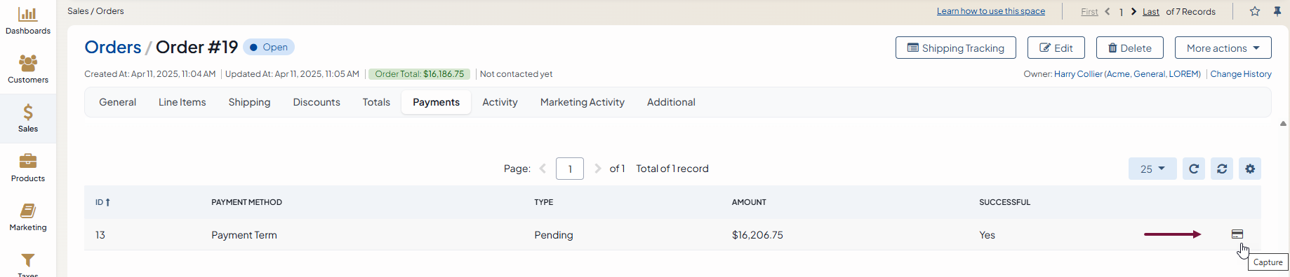 For instance, when the order is paid for by using a credit or a debit card, the payment status depends on the payment action selected for the credit/debit card payment method when configuring a payment integration. If such payment action is set to pre-authorization or final authorization, the order payment status will stay in the payment authorized status until the sales manager manually captures payment (i.e., clicks capture) in the OroCommerce back-office to complete the transaction. When the payment is captured, the payment status changes to paid in full.