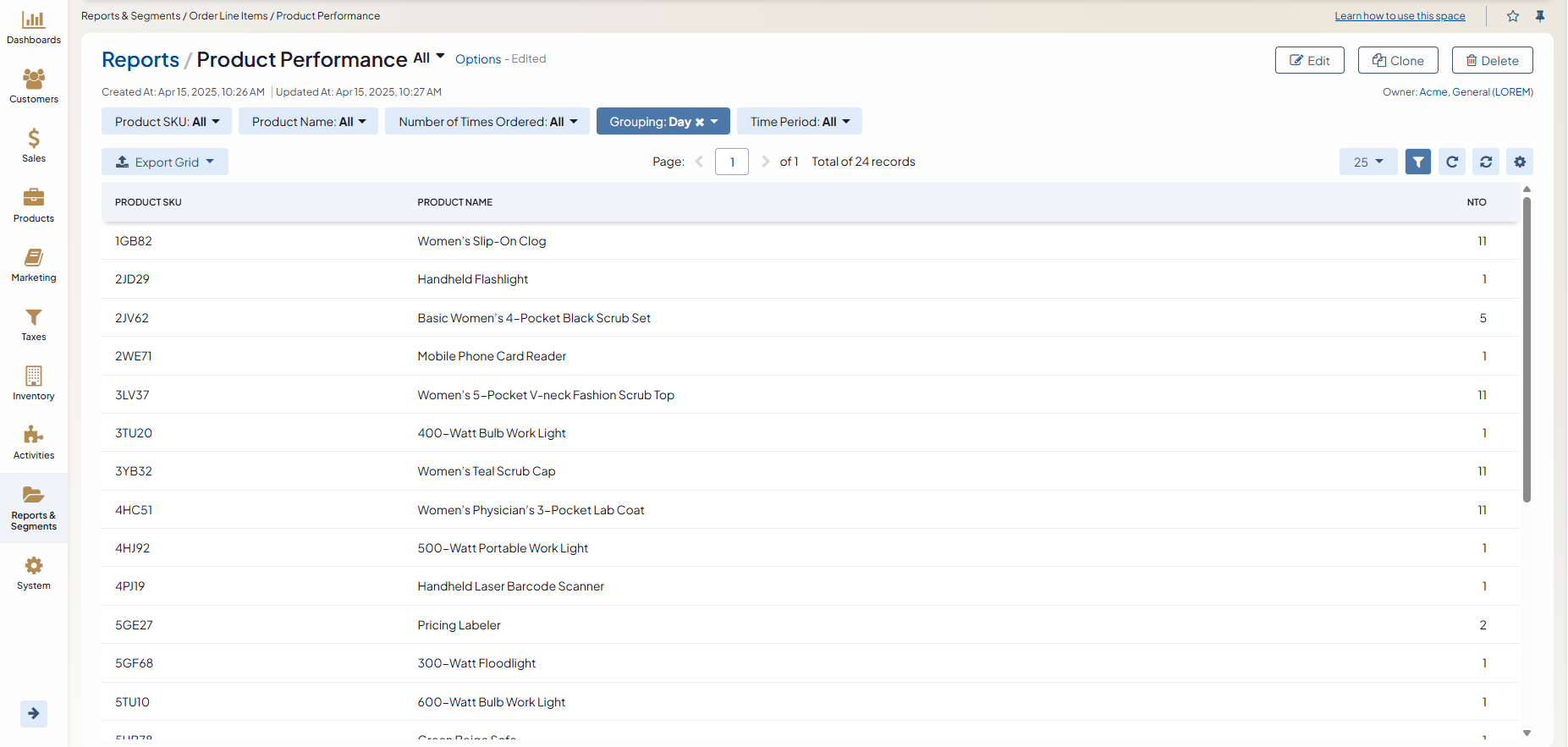 These need to be grouped by their values, i.e., product name and product SKU. Additionally, you can add any field conditions, such as the time period you are collecting the data from.