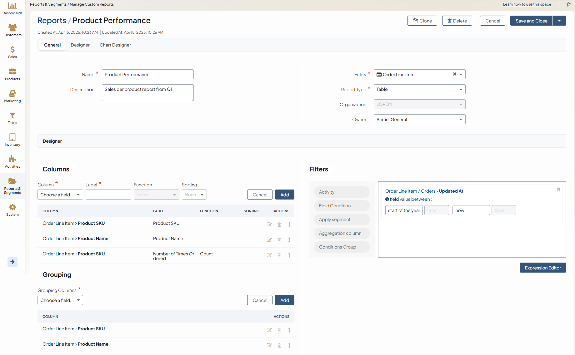 To create this report, we need to extract information from the Order Line Item entity, as we are going to calculate how many products have been ordered. For this, we need to add at least 3 columns to the new custom report: product name, product SKU, and product SKU with function count.