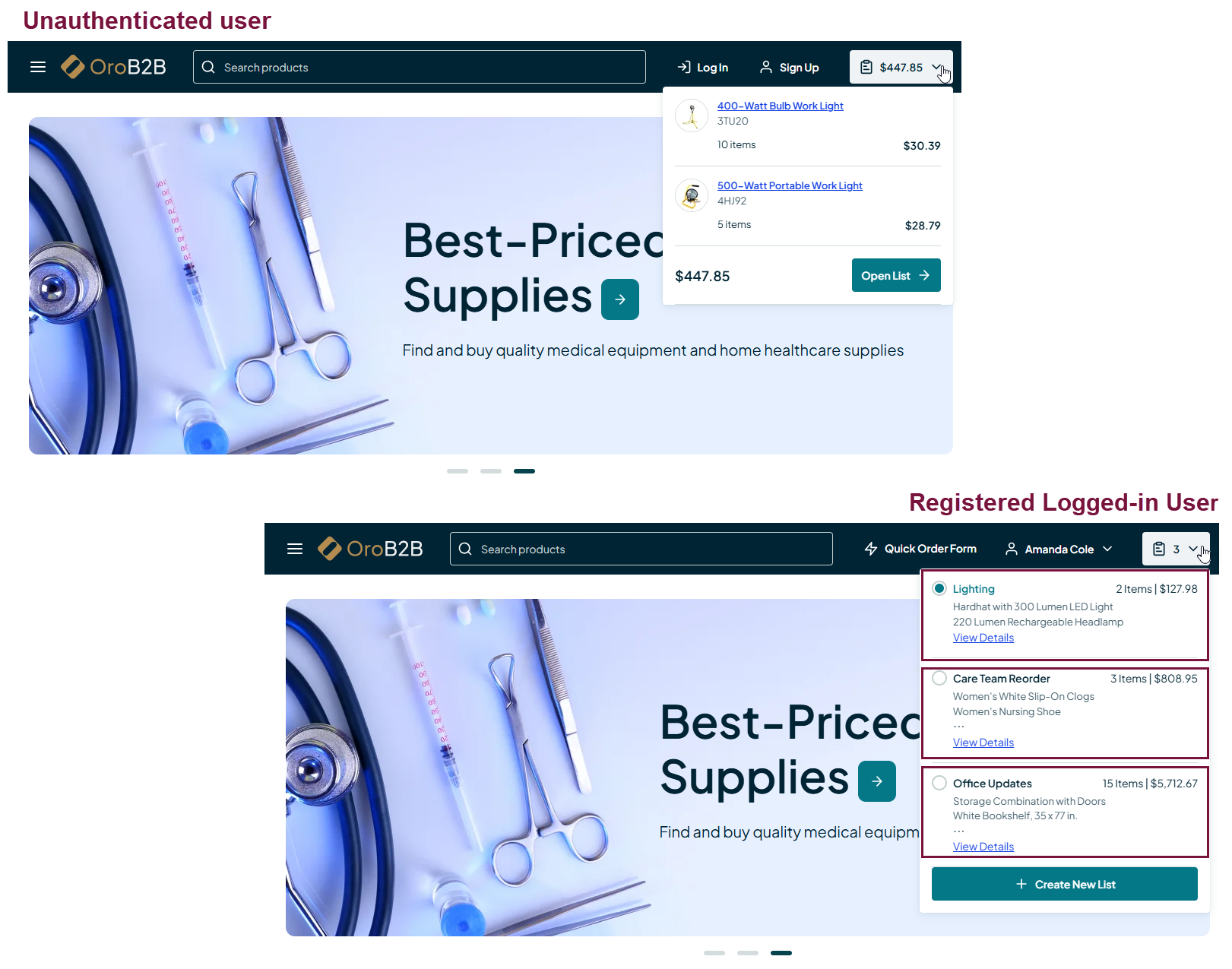 Buyers in B2B tend to work on numerous and varied projects that need different products for different business units within the organization, at the same time. It means that there is often a necessity to have more than one shopping cart for different needs. OroCommerce’s shopping lists are enhanced B2C shopping carts explicitly built for B2B interactions and enable buyers to work with multiple shopping lists at the same time, when necessary.