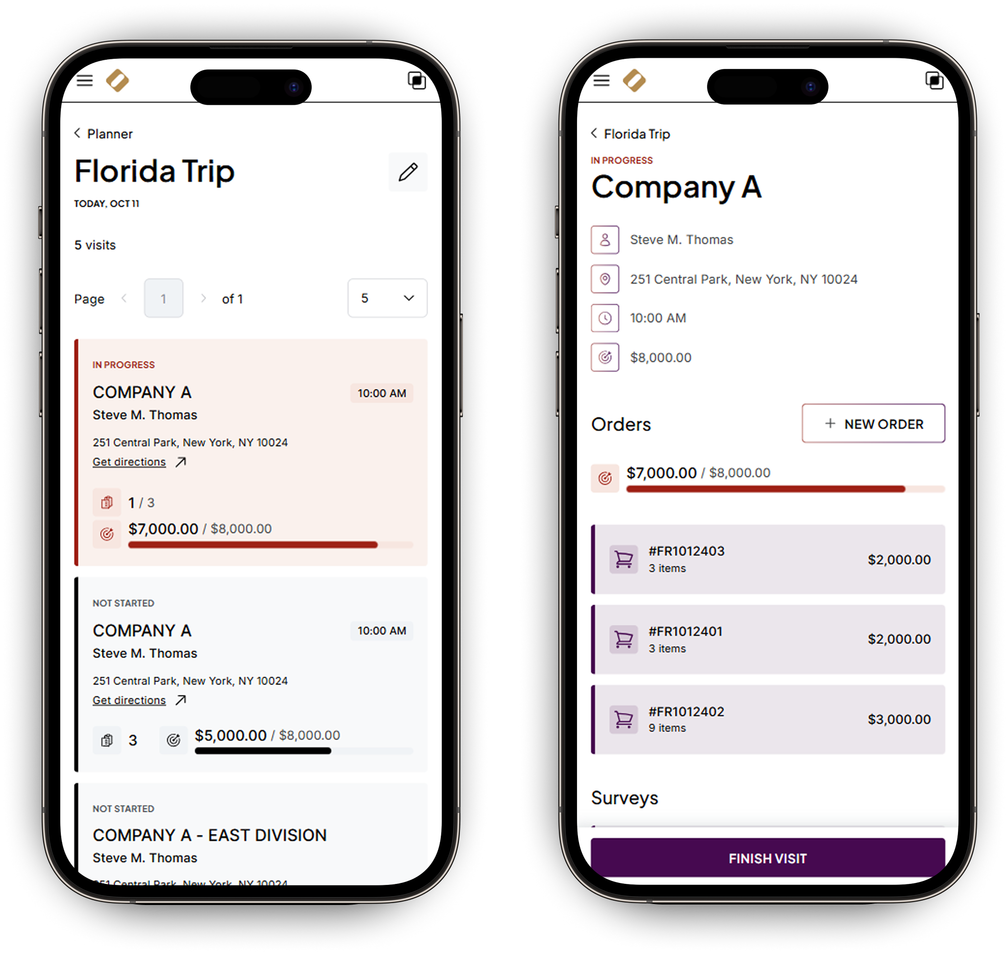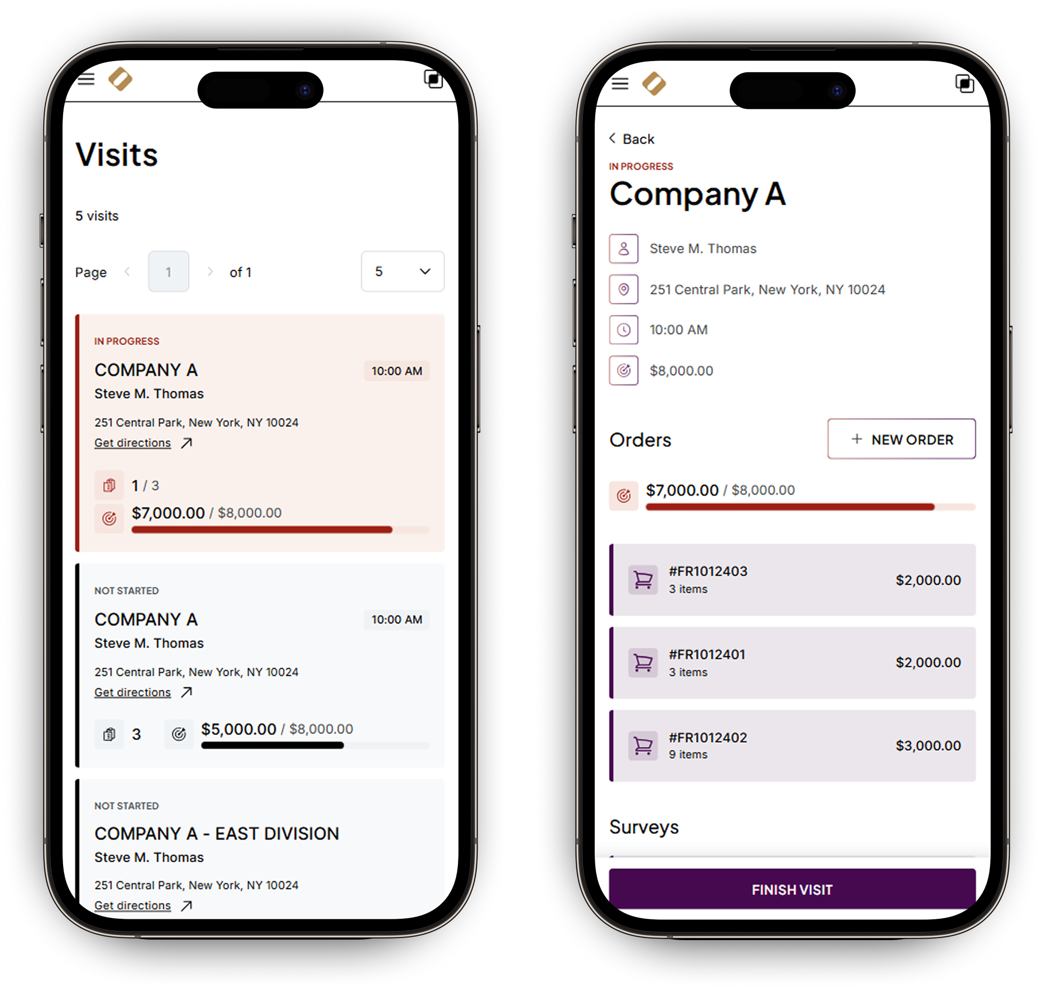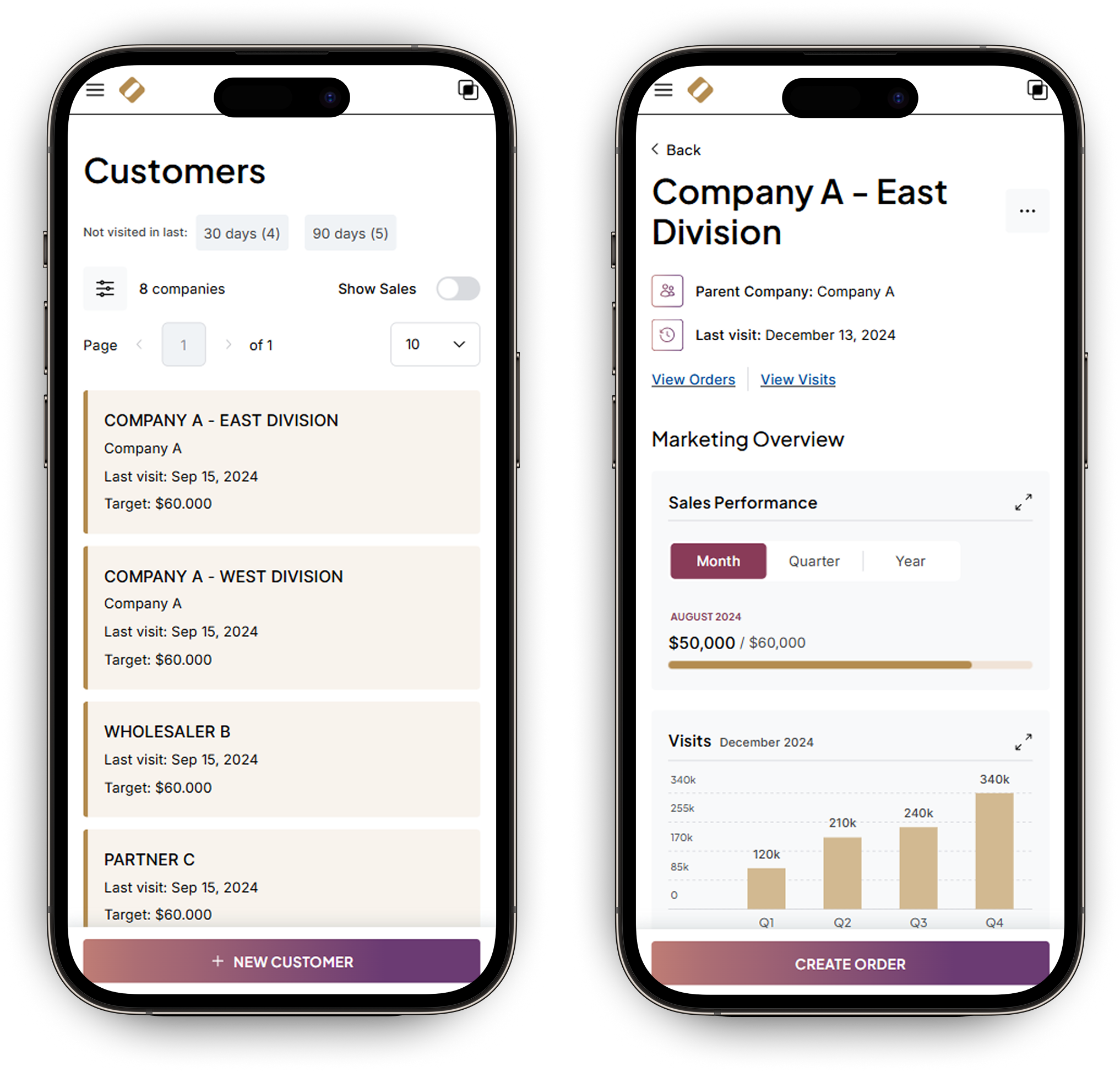 The app enables users to log and manage customer visits directly from their device. Sales reps can plan upcoming visits, mark visits as started or completed, and track the duration and outcomes of each interaction. This functionality helps monitor sales activities in the field, supports accountability, and provides managers with visibility into visit frequency and execution relative to sales targets or service levels. Reps can also create new orders directly from the Visits page.
