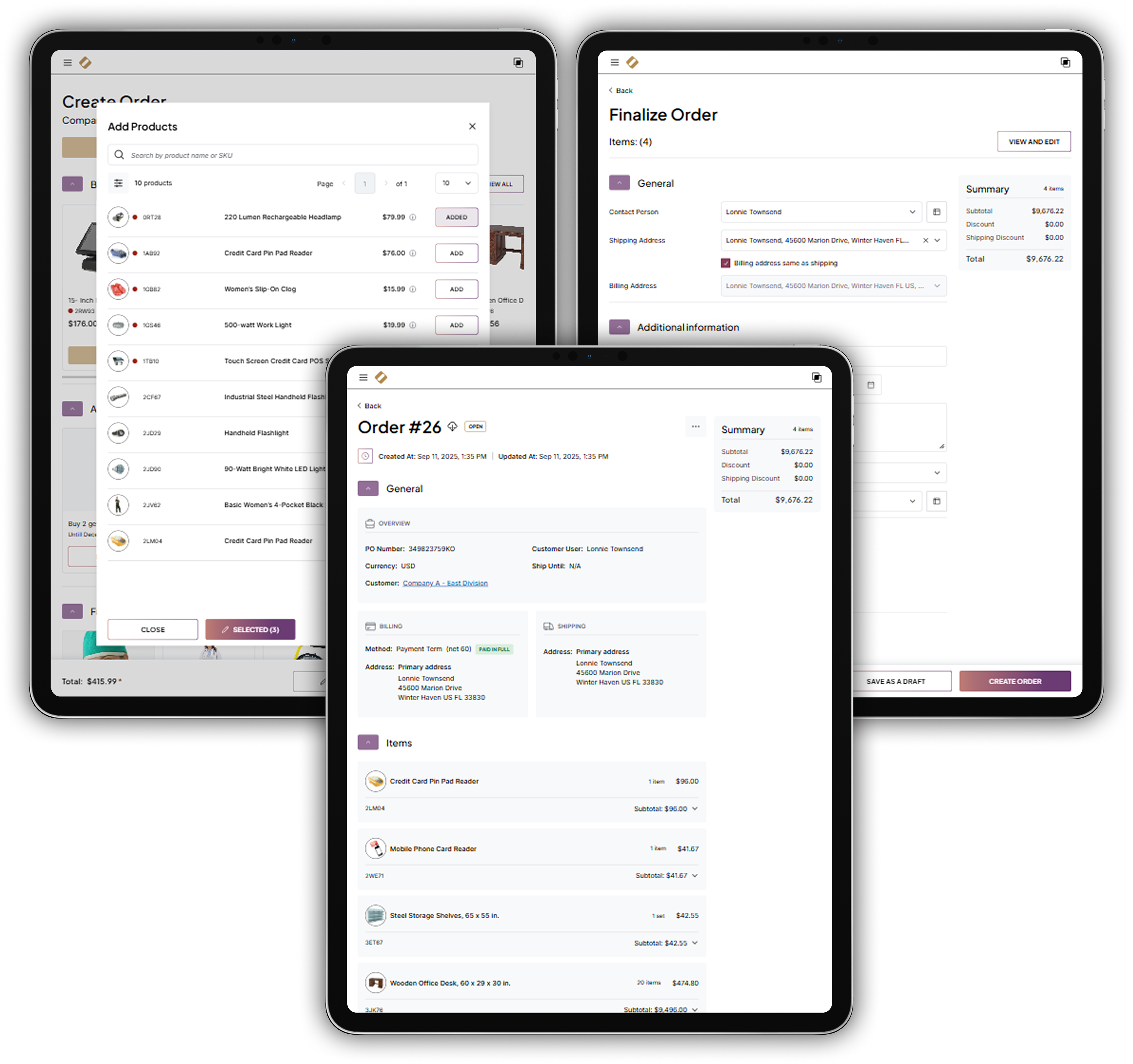 The Field Sales App provides a responsive, mobile-first interface designed for efficient use on smartphones and tablets. Sales representatives can quickly access key information such as customer accounts, contact details, product catalogs, and order history. The interface supports fast data entry and navigation, allowing users to create and edit orders or update customer records without delays. The design prioritizes usability in field conditions, minimizing the need for desktop tools.