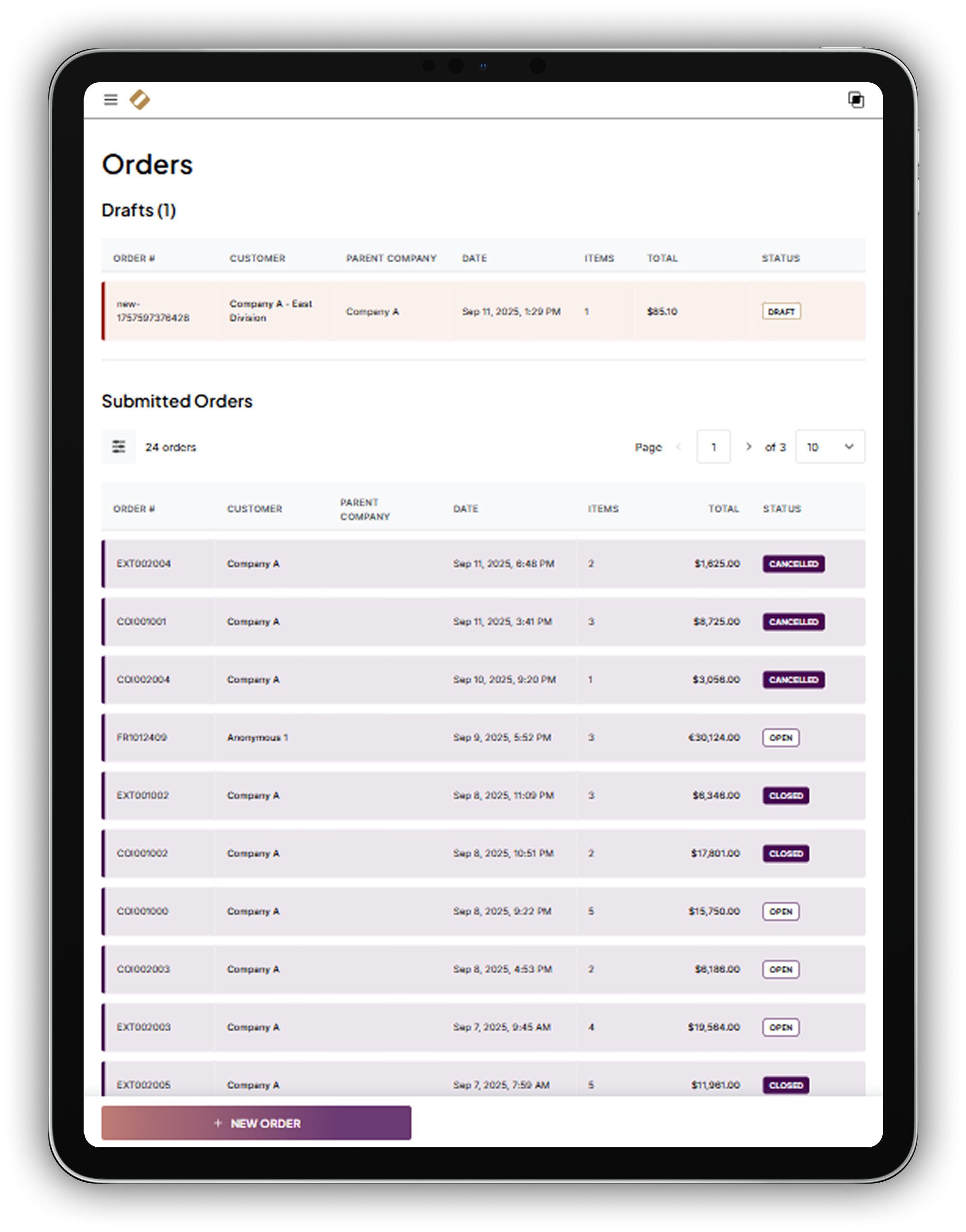 Orders can be created and edited in both online and offline modes. When offline, orders are saved as drafts until connectivity is restored. Once back online, all changes are automatically synchronized with the main system, and drafts are submitted accordingly. Previously submitted orders are also accessible and can be modified, with updates synced once the device reconnects.