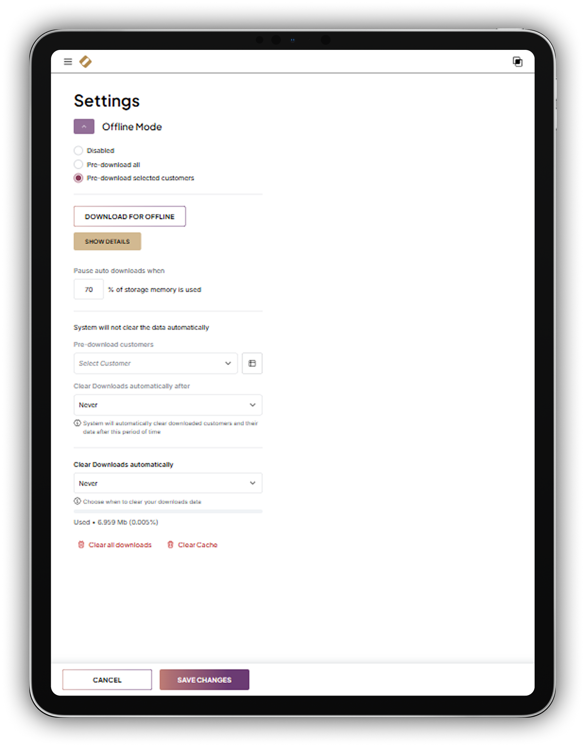 The Field Sales App is designed to function reliably in areas with limited or no internet access. Sales representatives can continue performing essential tasks such as capturing orders, logging customer visits, and updating records without requiring a network connection. All offline activity is automatically synchronized with the central OroCommerce system once connectivity is restored, maintaining data integrity across the platform. Administrators can configure offline behavior in the app settings. Data availability in offline mode is limited only by the storage capacity of the user’s device.