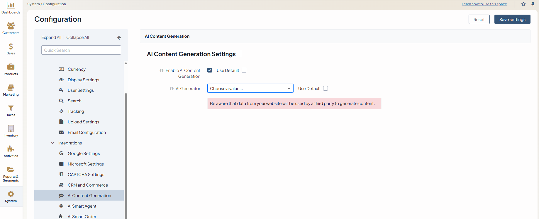 Once the AI Content Generation integration is configured in your Oro application, you can choose between the two clients and their models in the back-office system configuration settings on global and/or organization levels:
