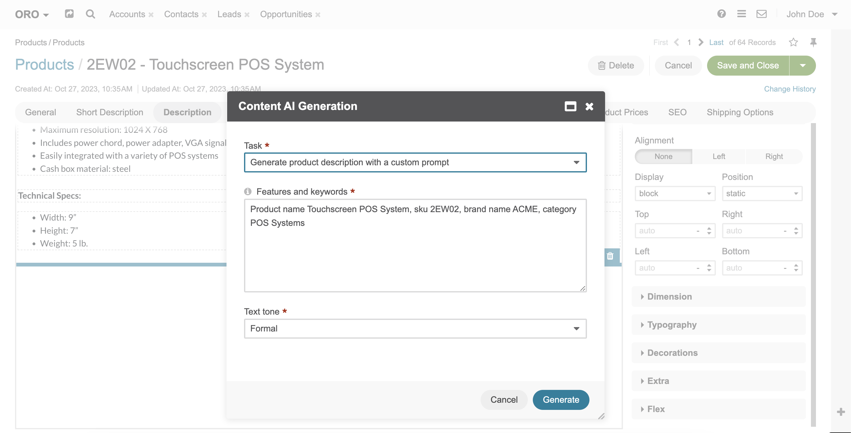 Oro offers an out-of-the-box integration with AI services to generate content for product descriptions, landing pages, content blocks, master catalog categories, and emails. Integration brings several benefits, including improved SEO with high-quality, unique content, significant time savings in content creation, and enhanced user experiences through more informative and engaging product descriptions on the website.