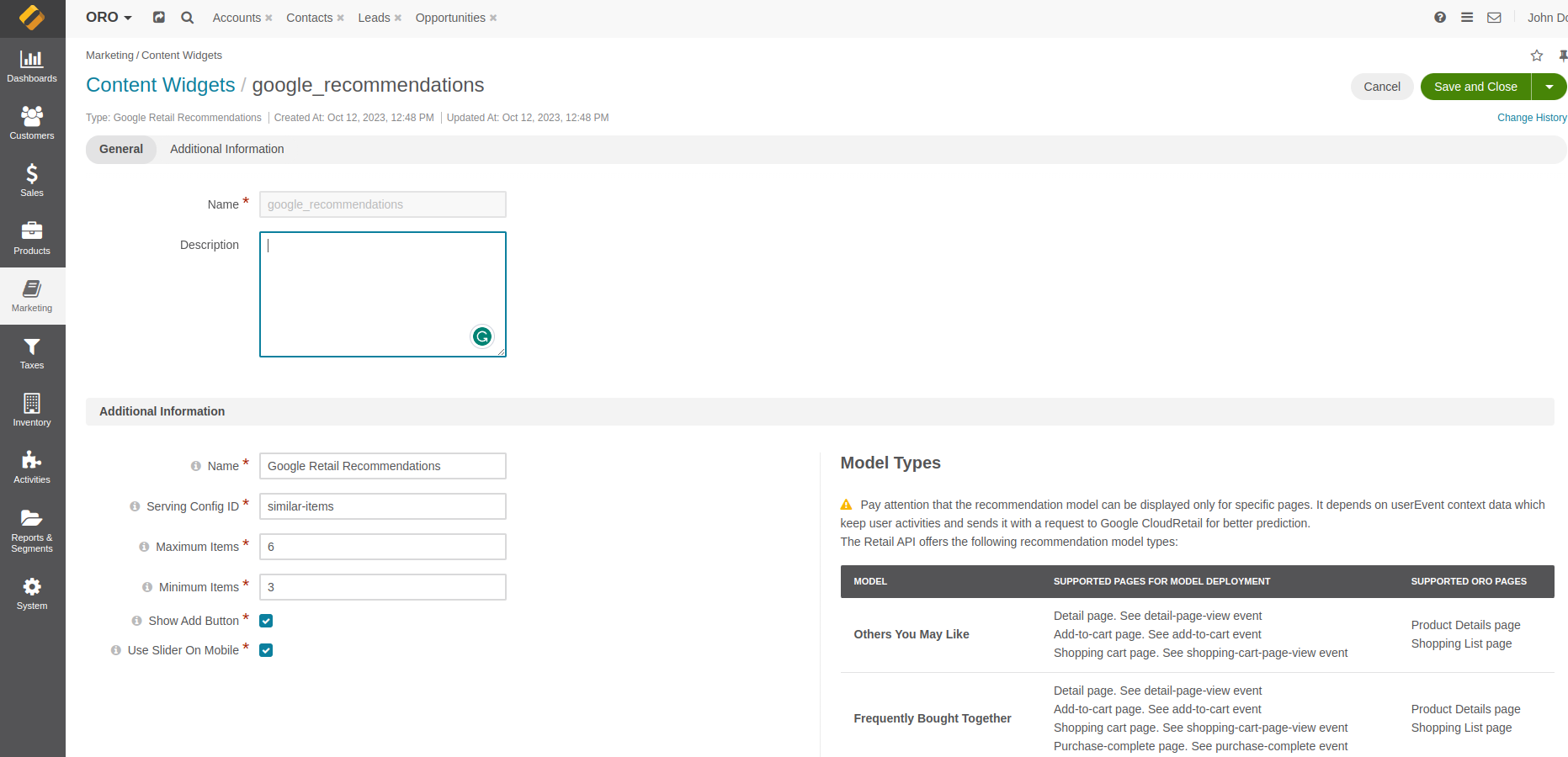 Once trained, these models can be added to various pages of your website such as the home page, search results page, product listing page, product detail page, shopping list, and checkout pages. Each of your trained models to these pages with the help of the generated serving config ID added to Oro’s Google Recommendations content widget. This will improve the user experience on your website, increasing customer engagement, and boosting conversion rates.