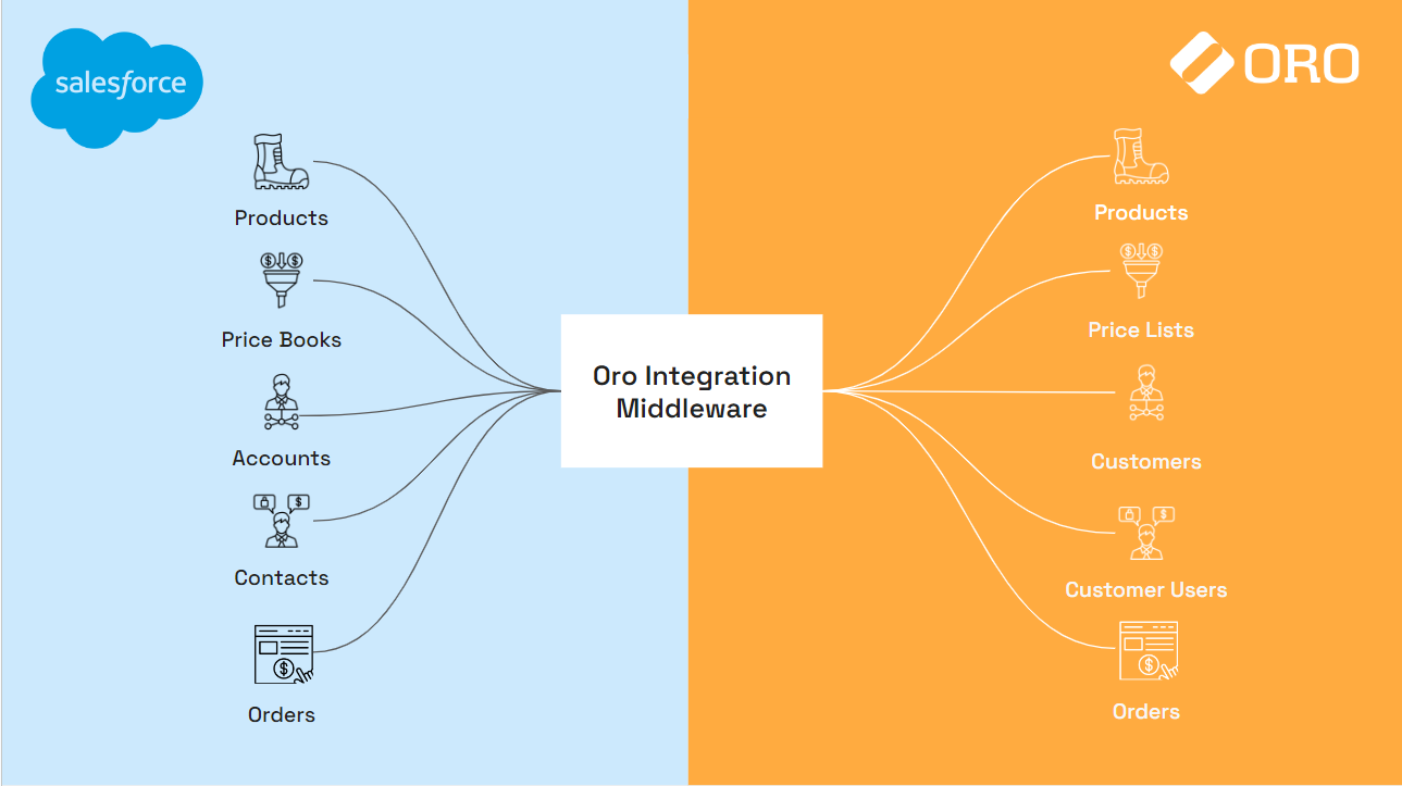 OroCommerce offers integration with Salesforce, a widely used customer relationship management (CRM) platform. It enables Salesforce merchants to use OroCommerce for their online stores and allows customers to easily access and purchase items through the Oro storefront.