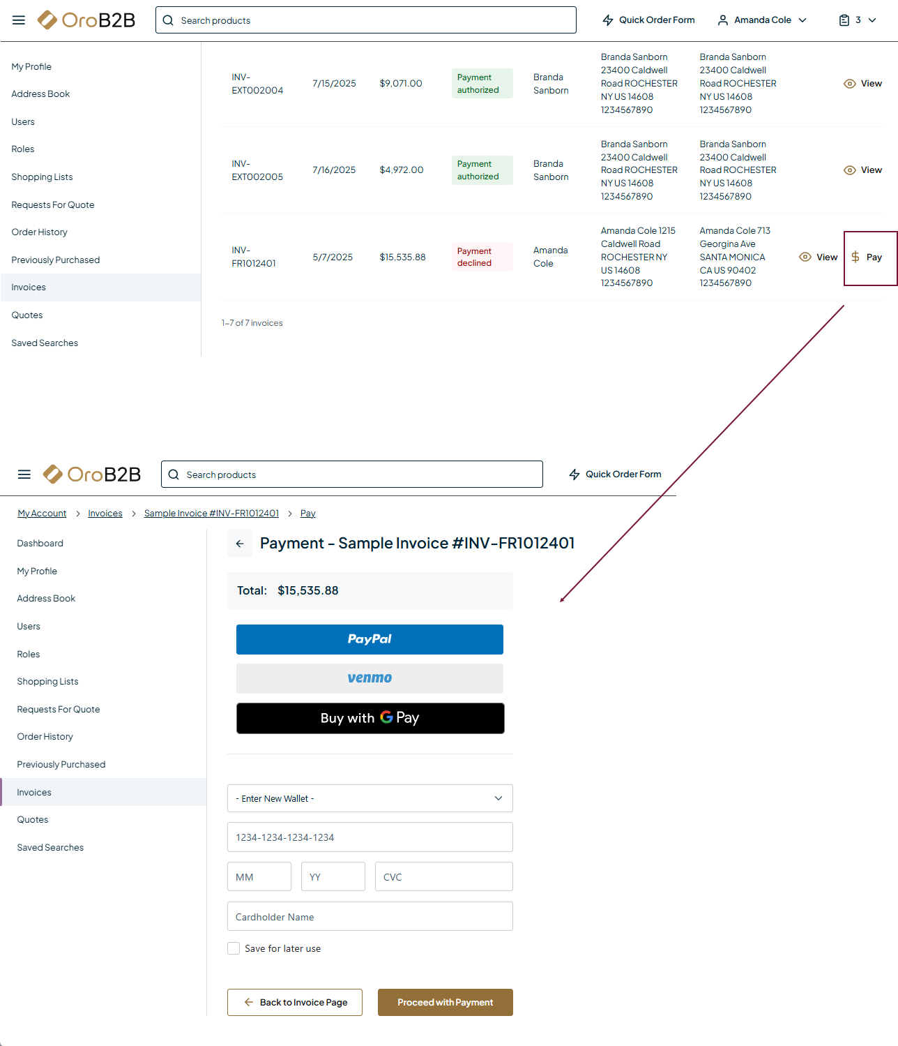 Checkout and Invoices — Enables buyers to pay either during the checkout process or directly from the storefront’s Invoices menu.
