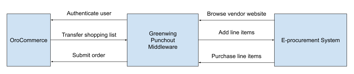 Below is an illustration of the data flow between Oro, Greenwing middleware, and e-procurement systems:
