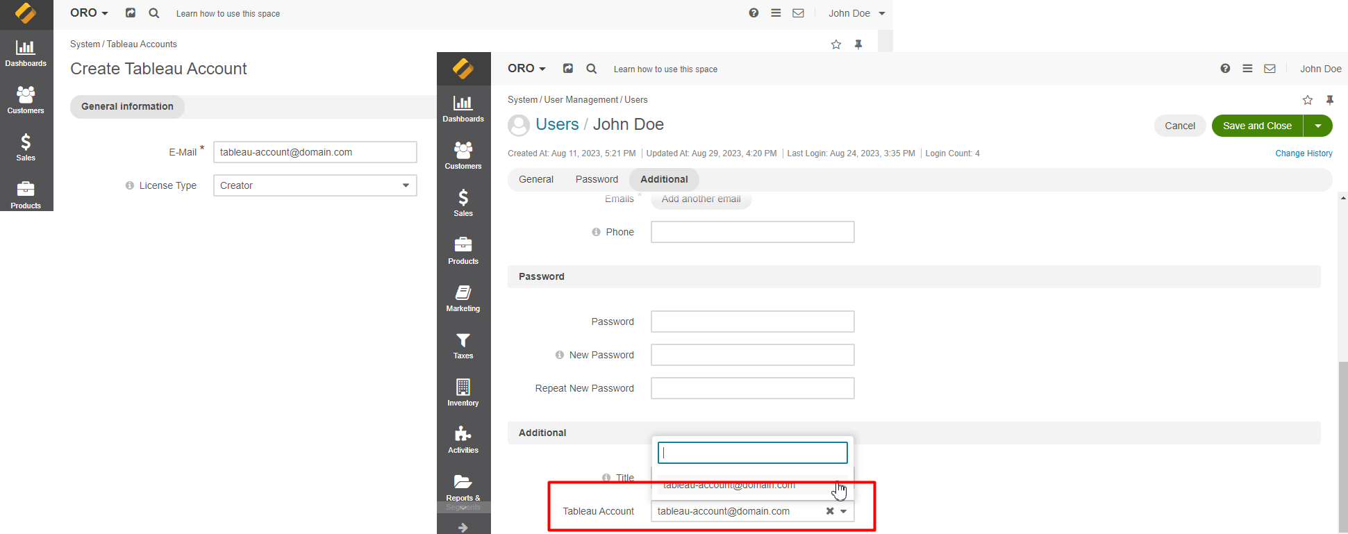 After creating an account, you can allocate it to individual users and specify access to Tableau accounts through role permissions in the Oro application. This will help reduce the number of Tableau accounts required, allowing multiple users to share one. Additionally, specific users can edit relevant Tableau reports in the Oro application if they do not have an active Tableau account, simplifying access and report management.