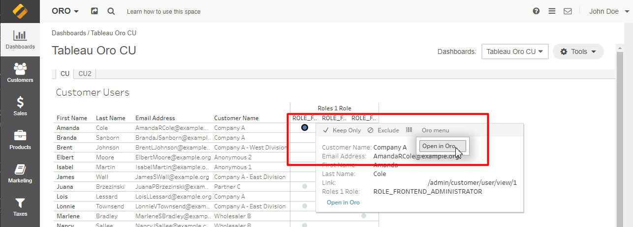 The integration enables you to connect data fields in your Tableau views with Oro entities through context menus. This makes it possible to navigate from a record in a Tableau report directly to the same record in the Oro application, allowing you to interact with it seamlessly.