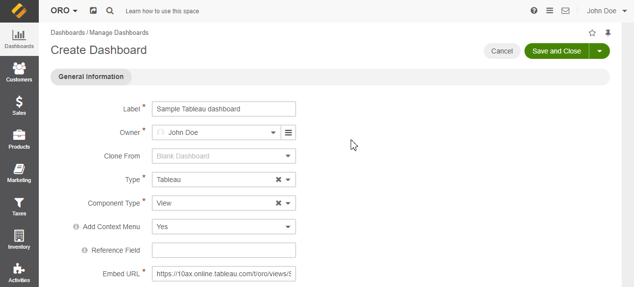 Tableau needs to be integrated into Oro via the Oro back-office UI
