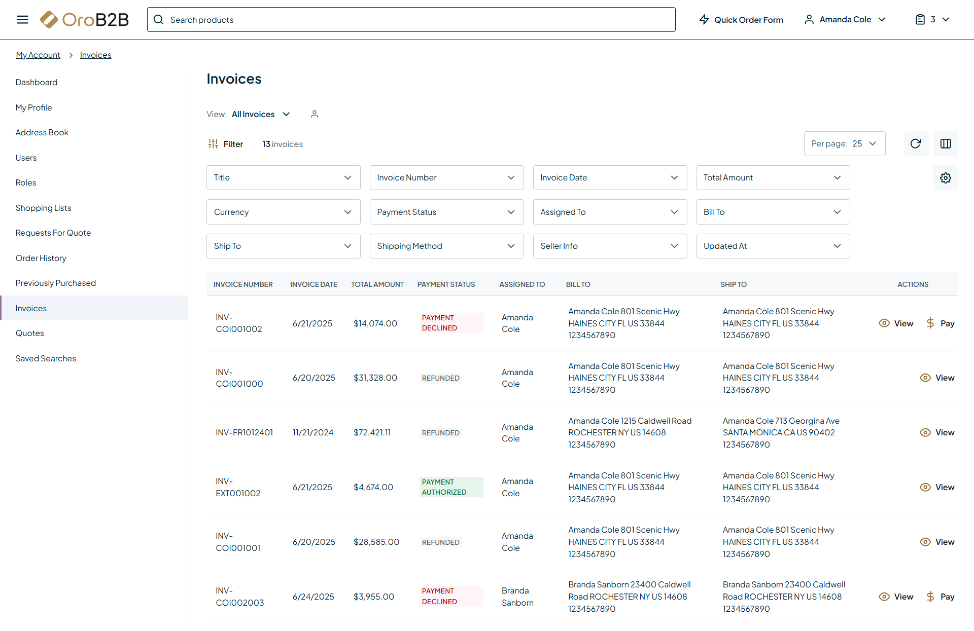 The Invoices feature enables customer users to view, download, and pay invoices directly in the OroCommerce storefront. The feature supports one-click payments for individual invoices.