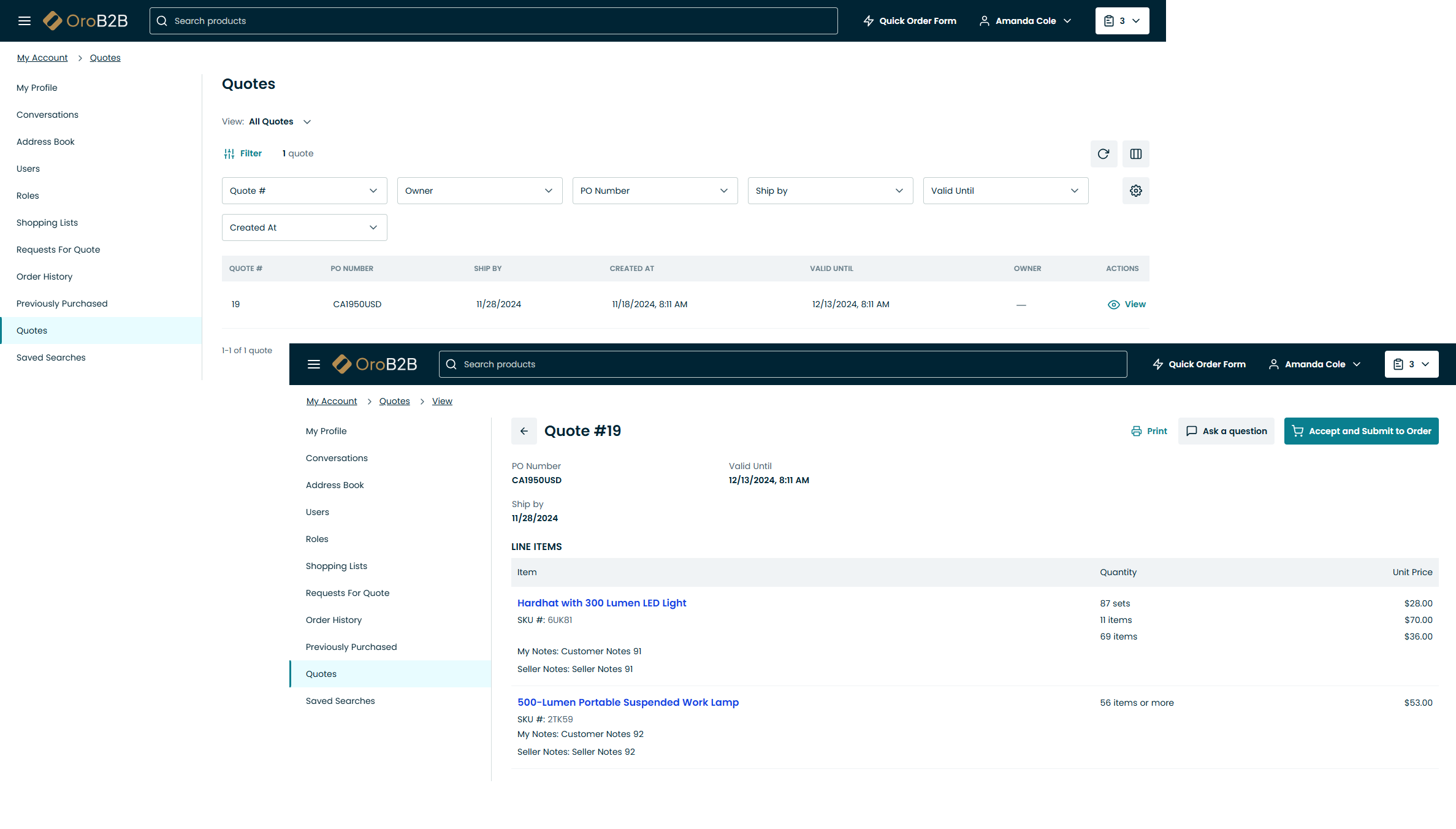 The Quotes section provides the details on all your created and submitted quotes. Here, you can negotiate with sales representatives on requesting a better price, more convenient quantities and additional services, view, accept, and submit an order based on the offered prices and conditions. In the storefront, this page is nested under the Quotes section of the user menu.