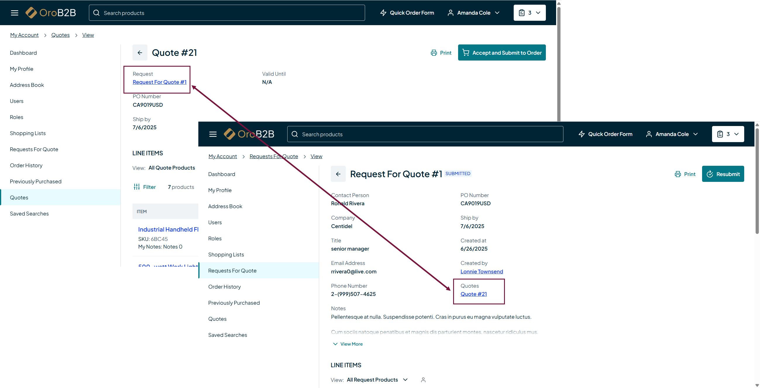 If a quote is related to an RFQ, you can navigate to its page via a dedicated link on the quote page.