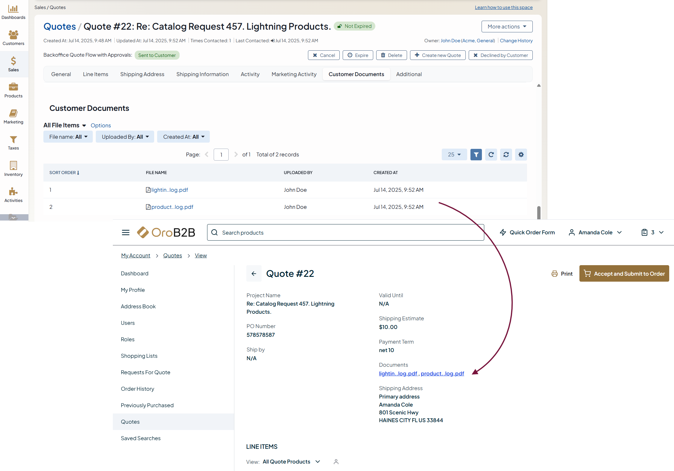 If a quote has any relevant documents uploaded for the customer user, these will be visible on the quote page: