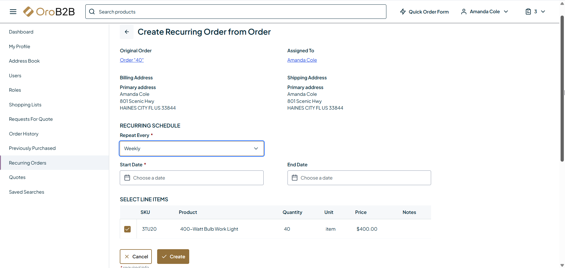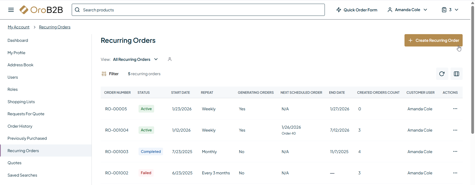 The Recurring Orders page in the storefront allows customer users to view, manage, and create recurring orders based on previously submitted orders. Recurring orders help automate repeat purchases by generating new orders on a predefined schedule.