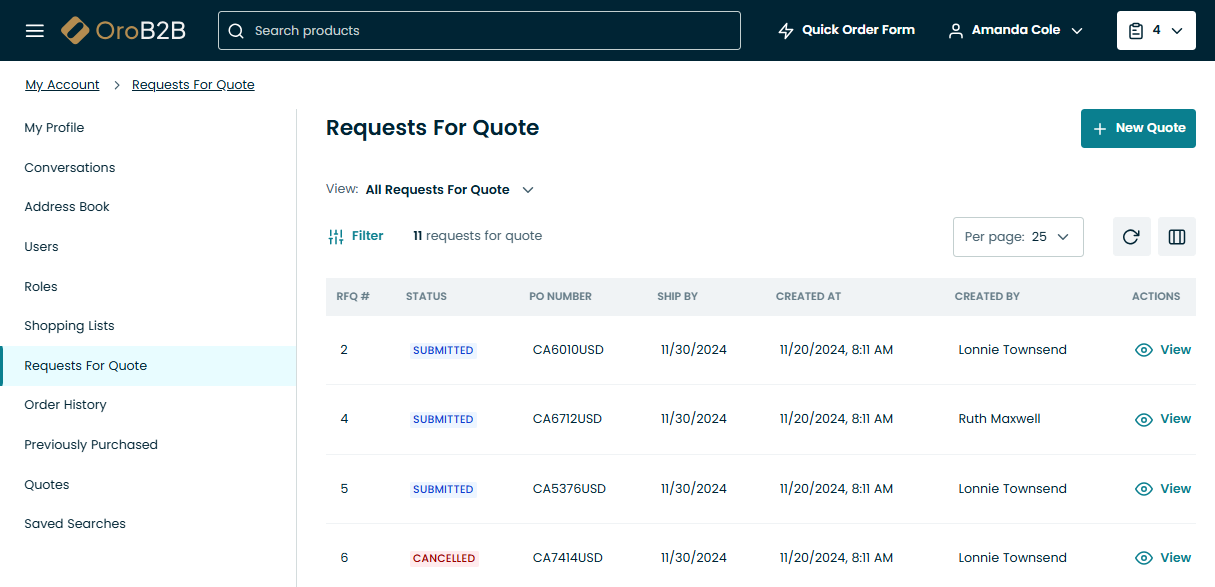 On the All Requests for Quote Page