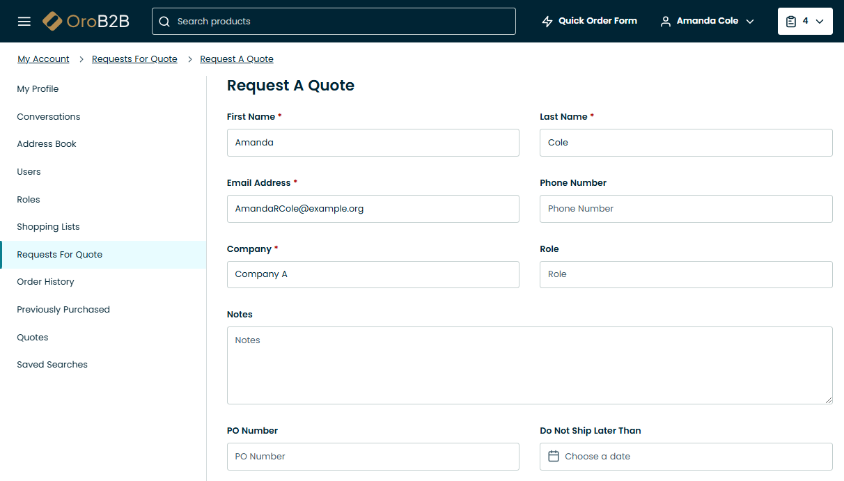 In the Request a Quote section, provide: