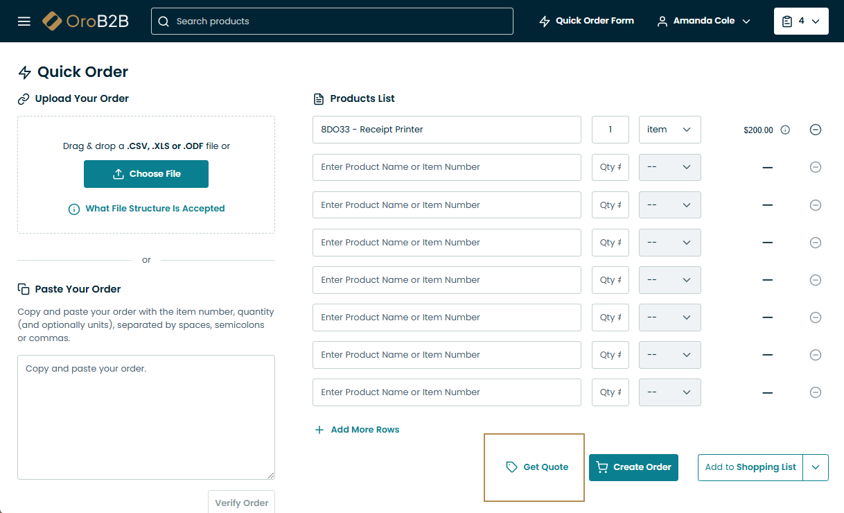 Registered users can also request a quote via the quick order widget in the top navigation bar. In the quick order page, click Get Quote at the bottom of the page.