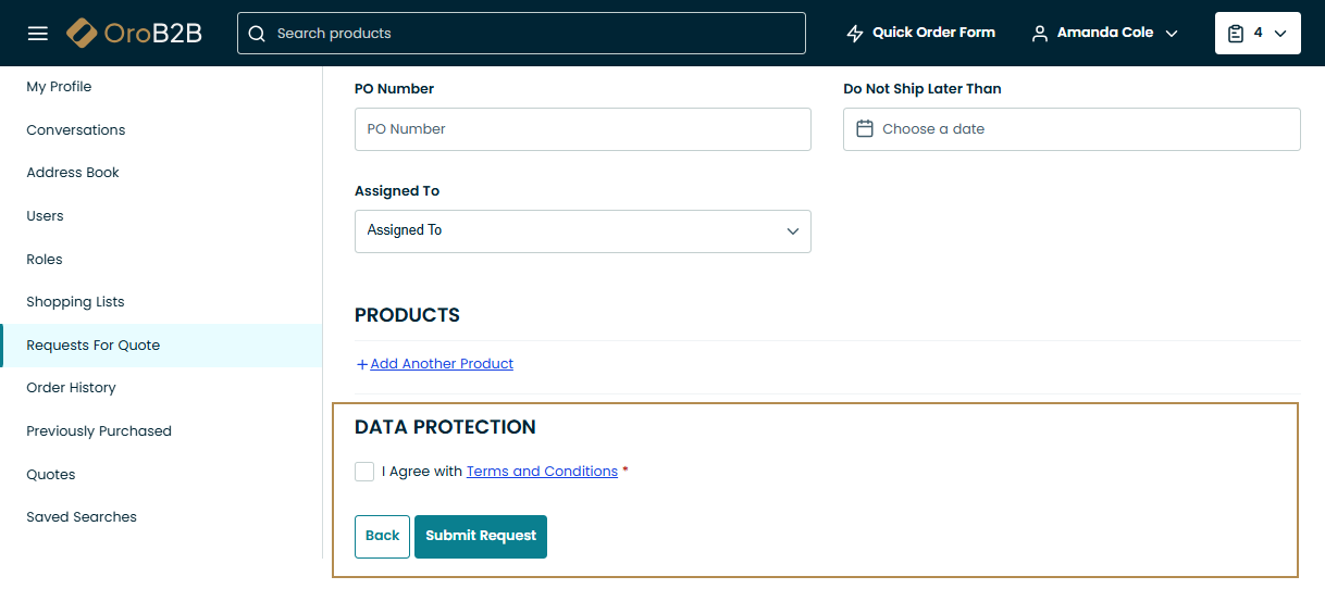 In the Data Protection section, you may be required to accept mandatory consents to process your personal information. If the consent is not accepted, you cannot submit the RFQ.