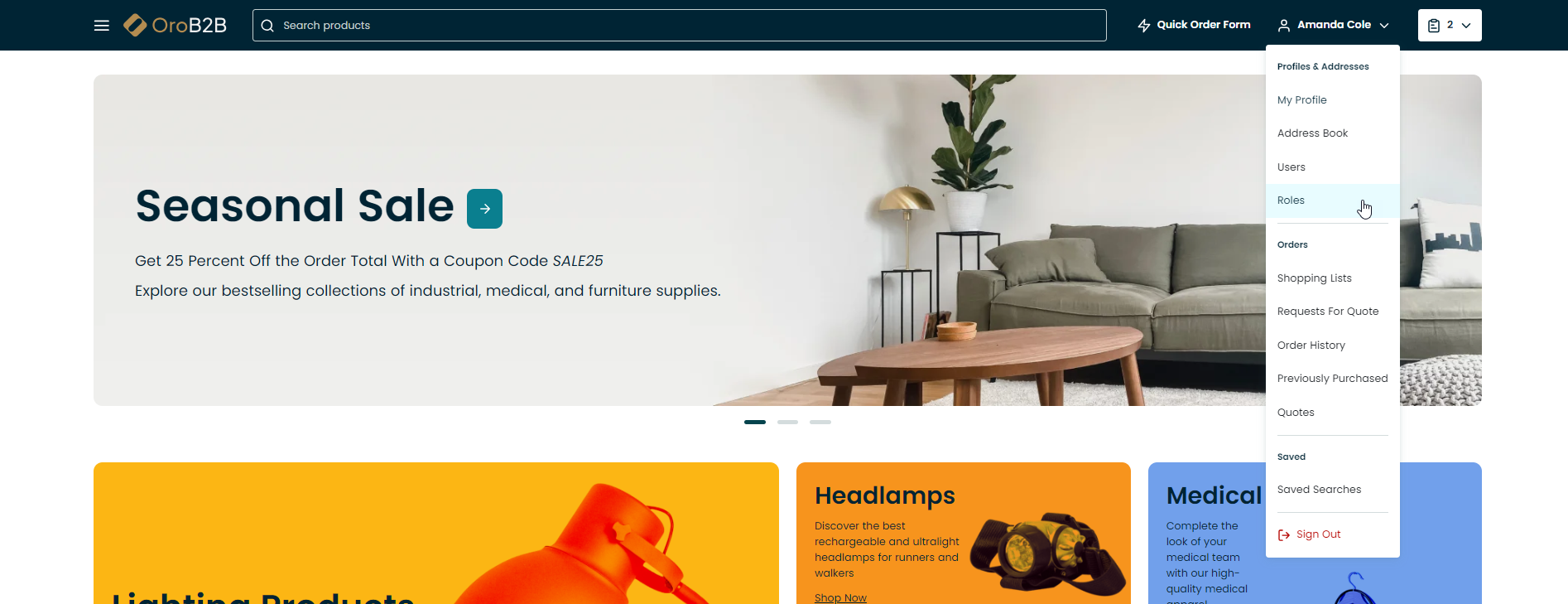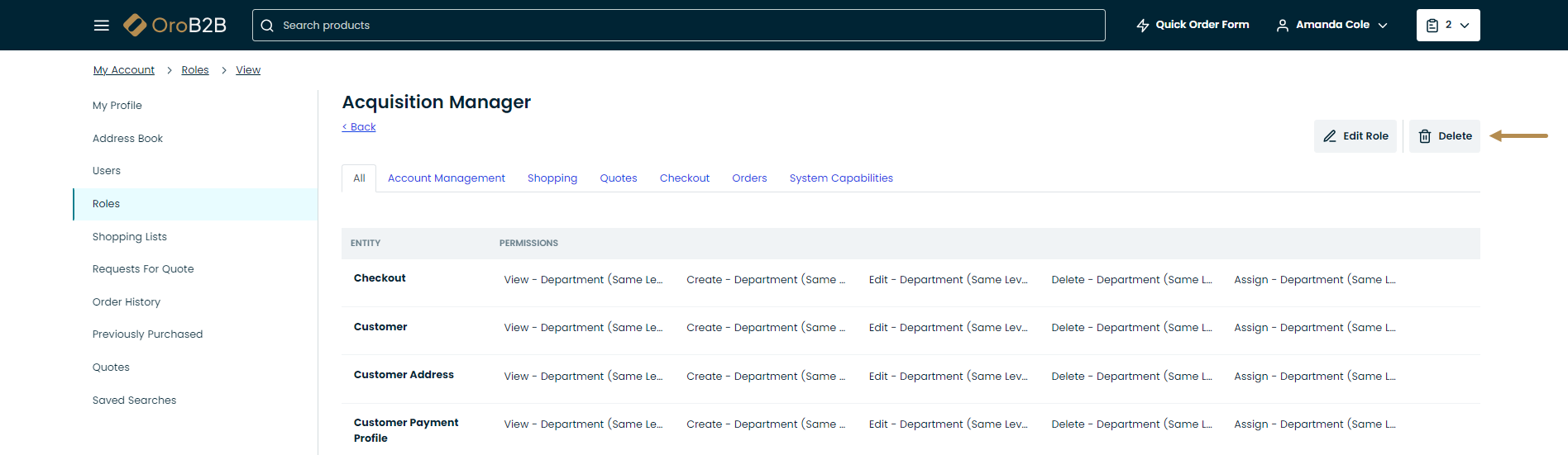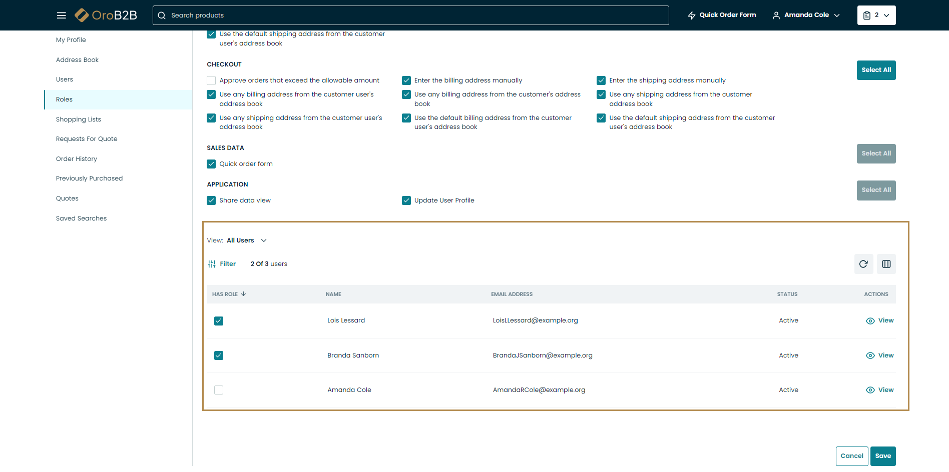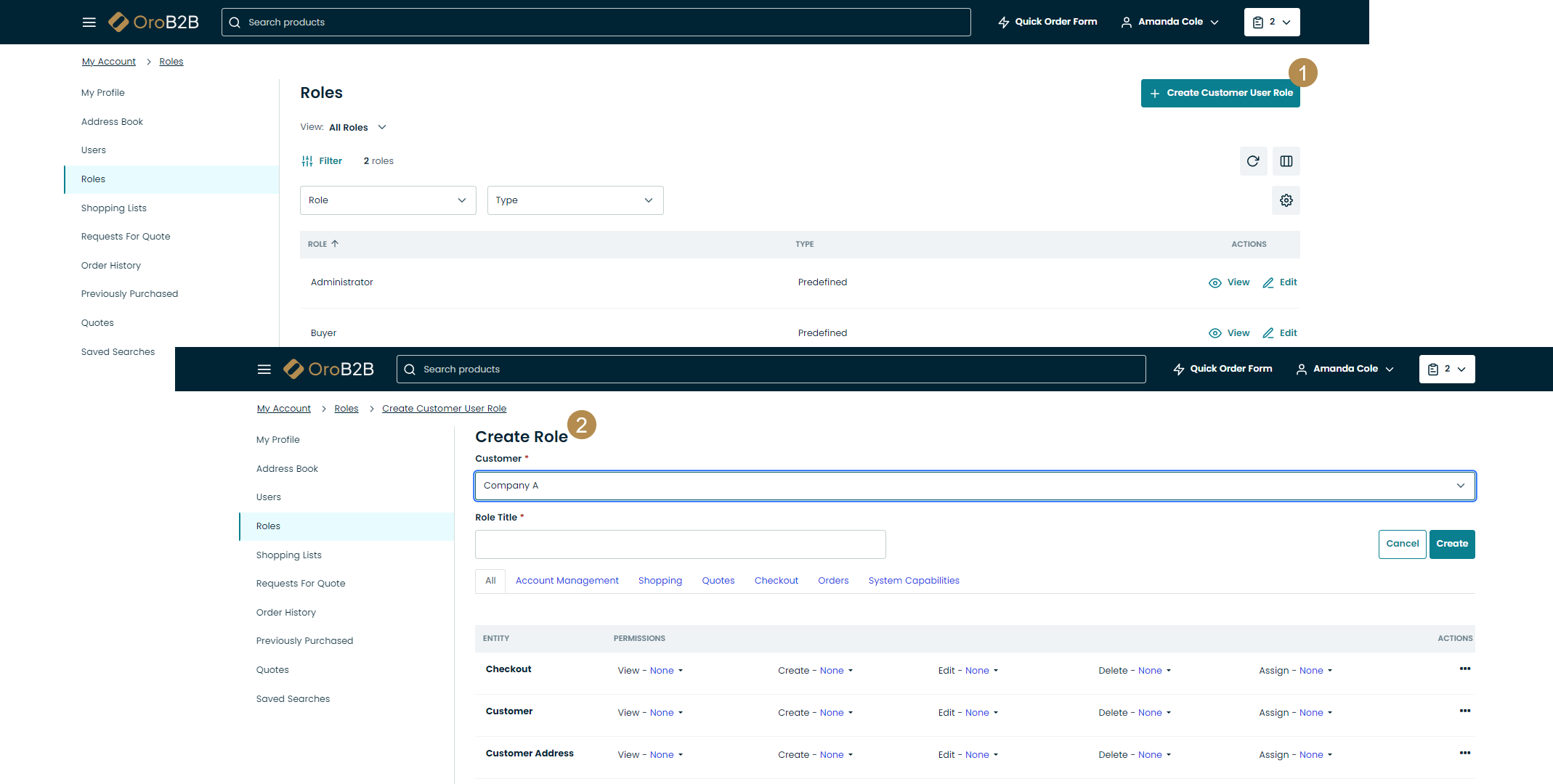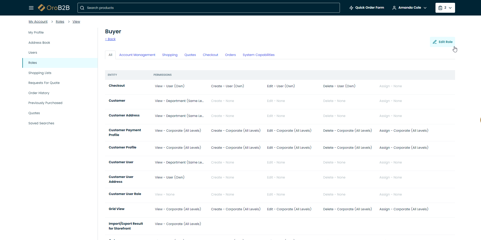 Roles are predefined sets of permissions. In the Roles section, you can view, edit and create new roles to define the level of permissions and access to the actions and data in OroCommerce storefront for the users of a specific role.