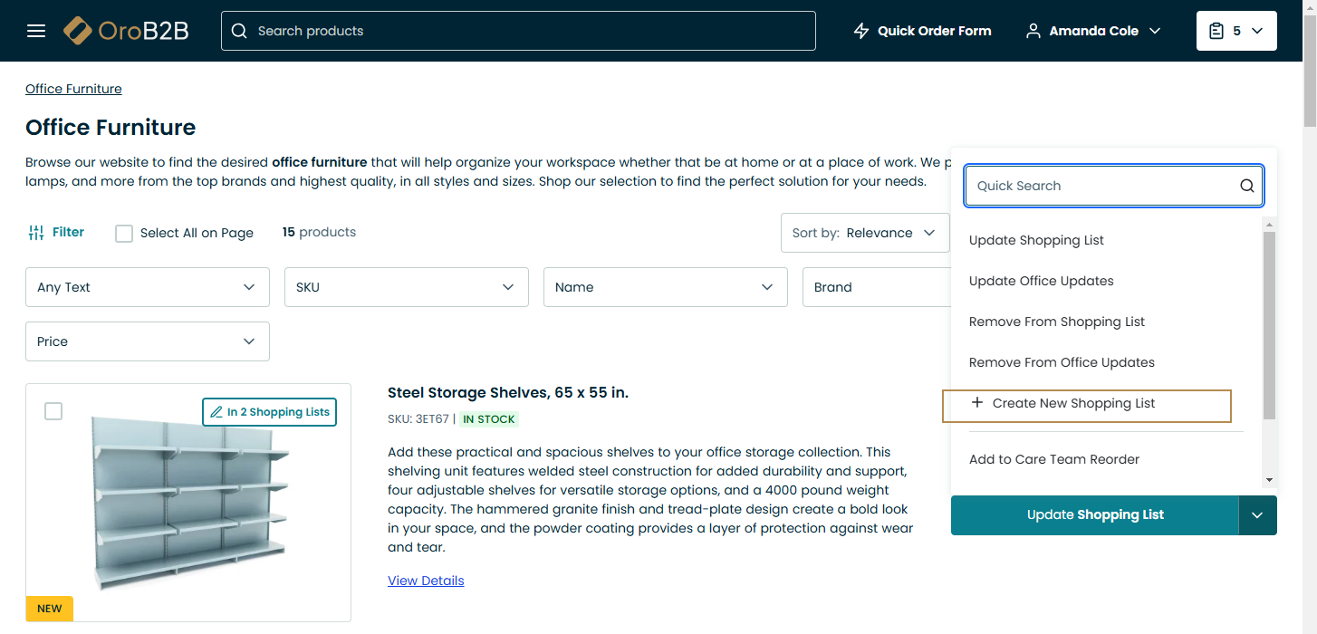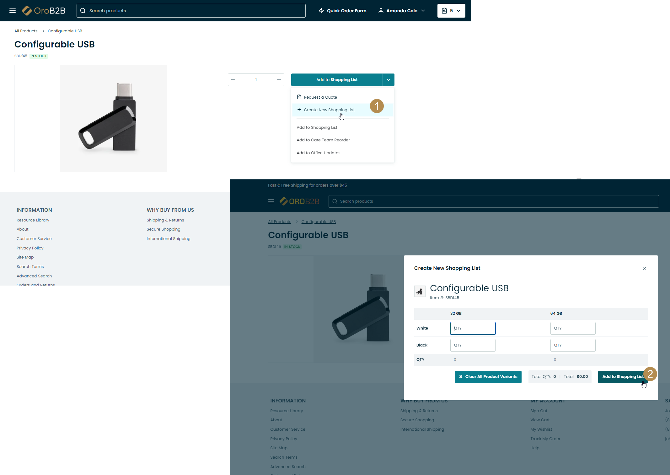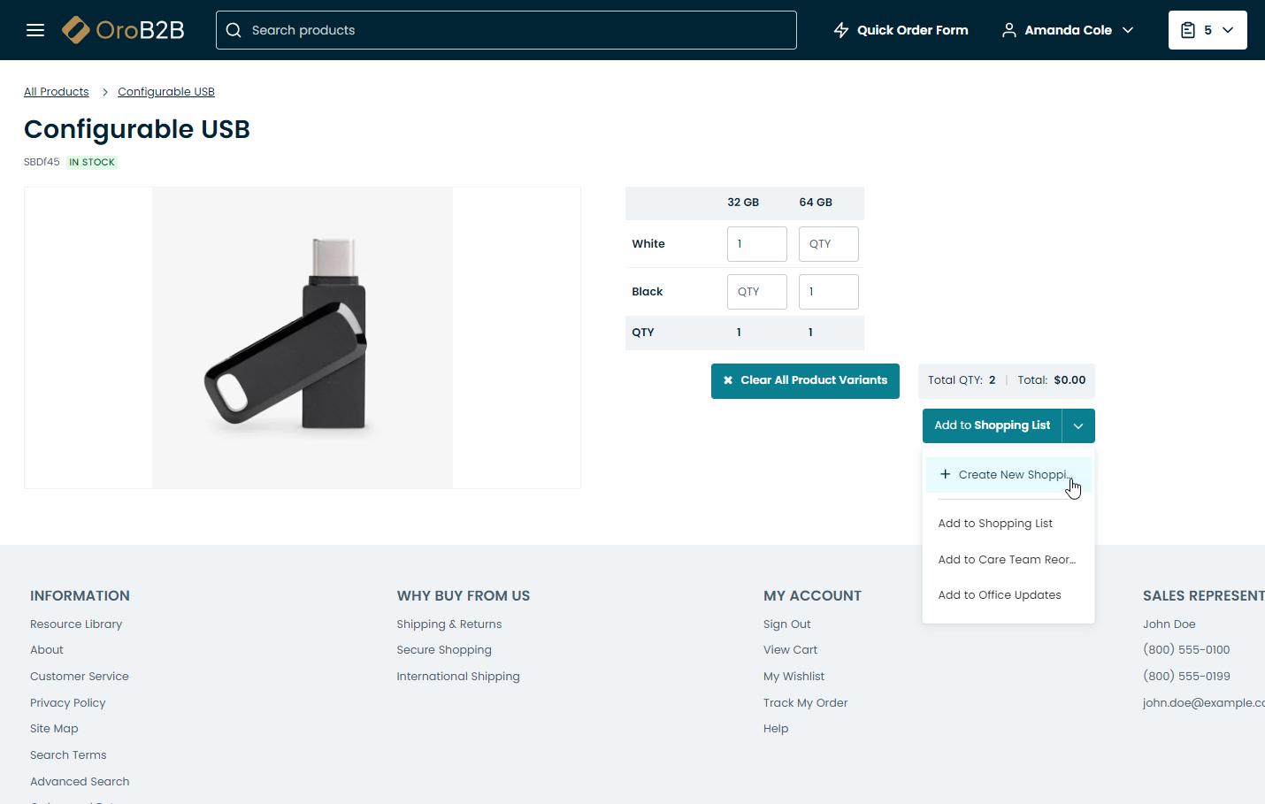 Configurable products (products that have many variations) can be purchased either via an inline or pop-up matrix form. You can create a new shopping list next to Add to Shopping Lst by clicking on the drop-down icon and then Create Shopping List.