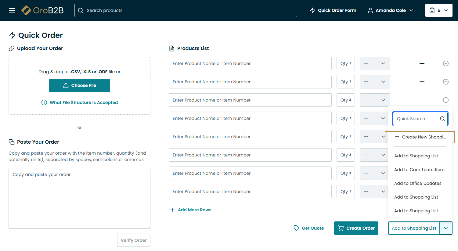 In the Quick Order Form, enter product SKU(s) and quantity.
