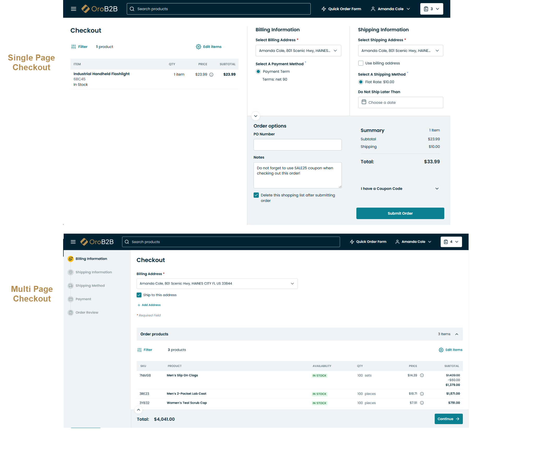 In the Oro storefront, the checkout can be multi page or single page. Although the checkout steps themselves are the same, the way they are displayed is different. For the multi page checkout, each step is displayed on a new page. For the single page checkout, all steps fit one page.
