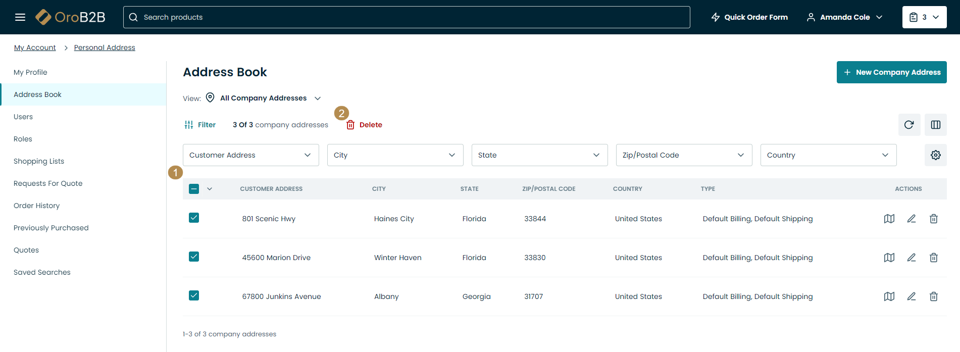 In the storefront, mass delete action is available in the Address book and Users sections only for the registered users.