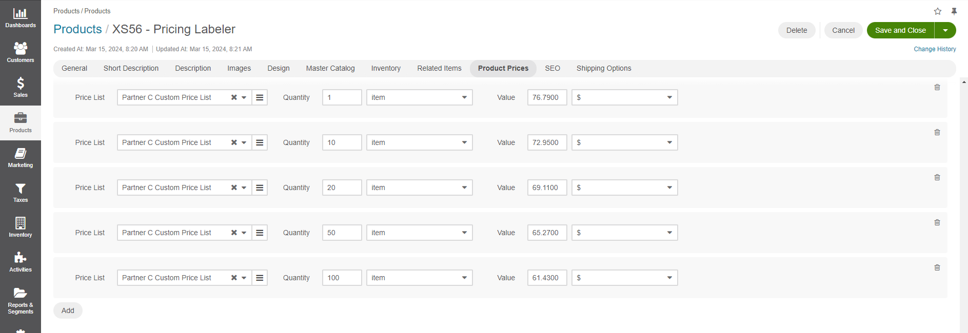 Suppose we have one product in the default price list with the following price tiers set in the back-office:
