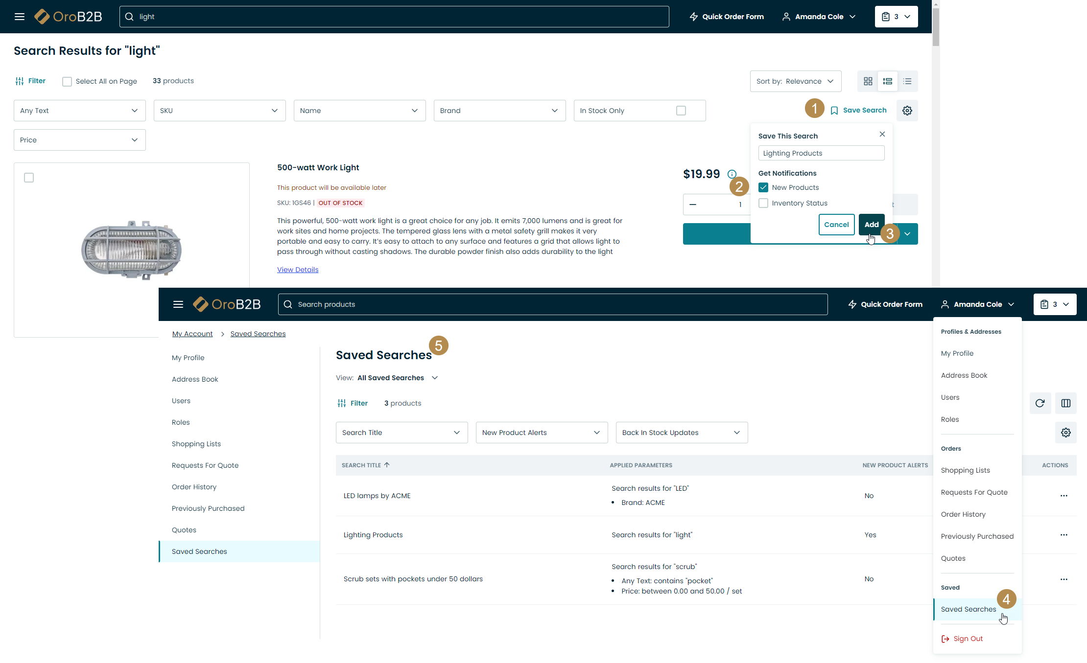 Customer users can save search queries, return to these saved search queries later, receive notifications when a new product falls under the search conditions and when products from the search query result are back in stock.