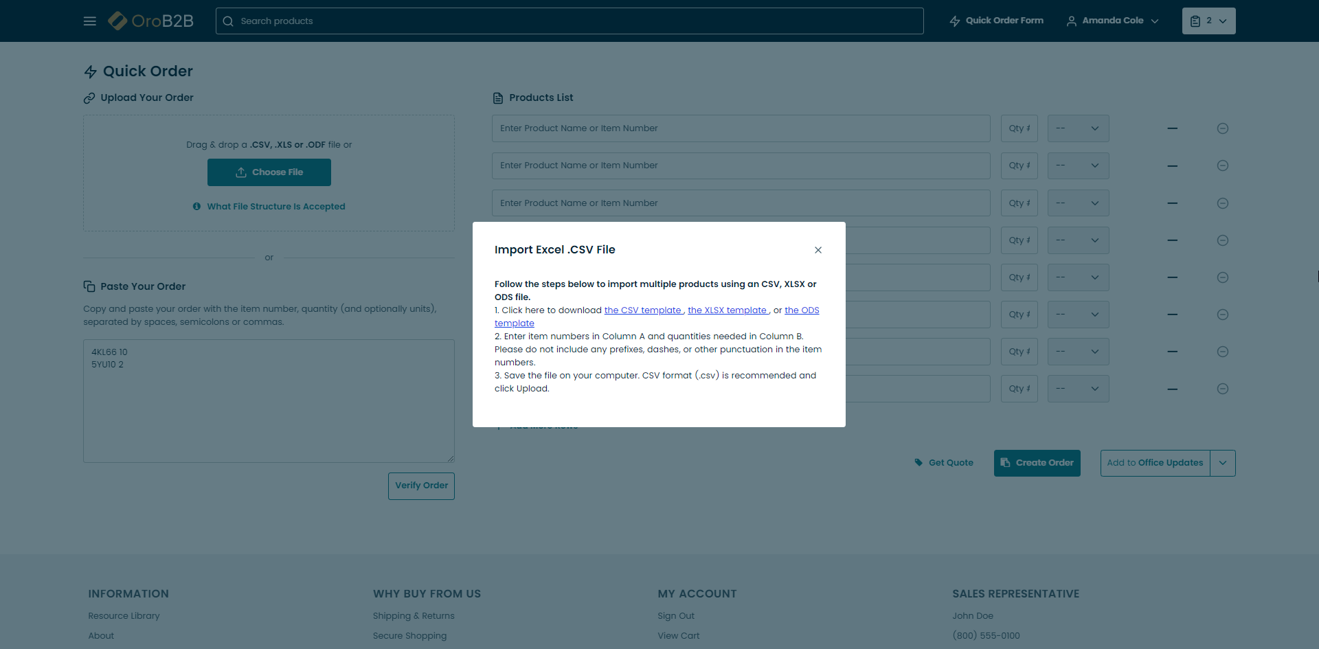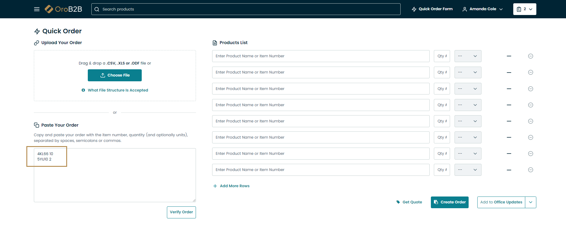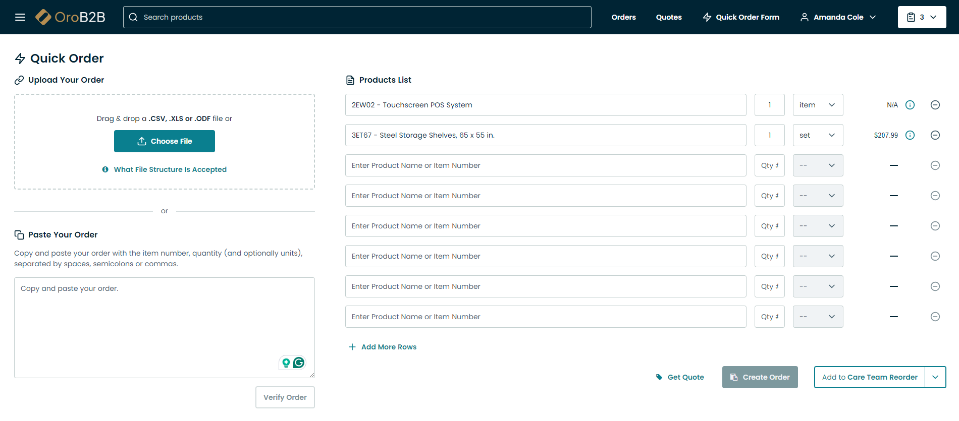 To create an order using a quick order form, click Quick Order on the top right. You can fill in the form either by providing the details of the order manually, copying and pasting the SKU and quantity, or uploading a file with order details.