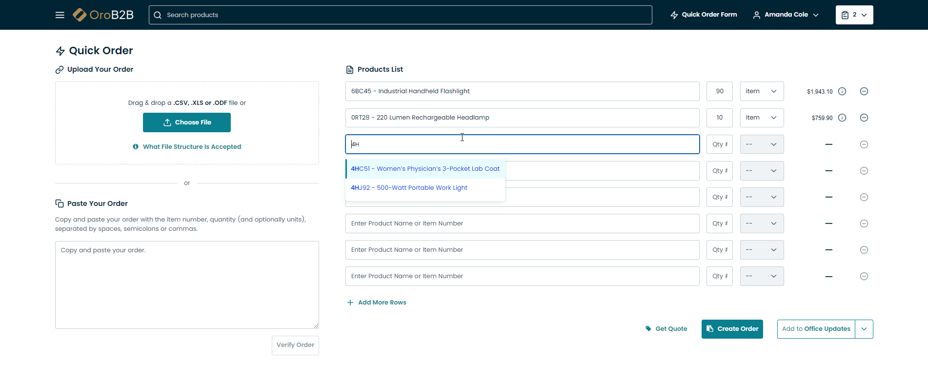 The quick order form allows customers to work on large orders efficiently by searching by product SKUs and names or by importing their purchase lists into the system. Customers can work on multiple orders simultaneously and easily switch between different shopping carts or start new orders at any time. Availability of the Quick Order feature is configured in the back-office for registered and guest users.