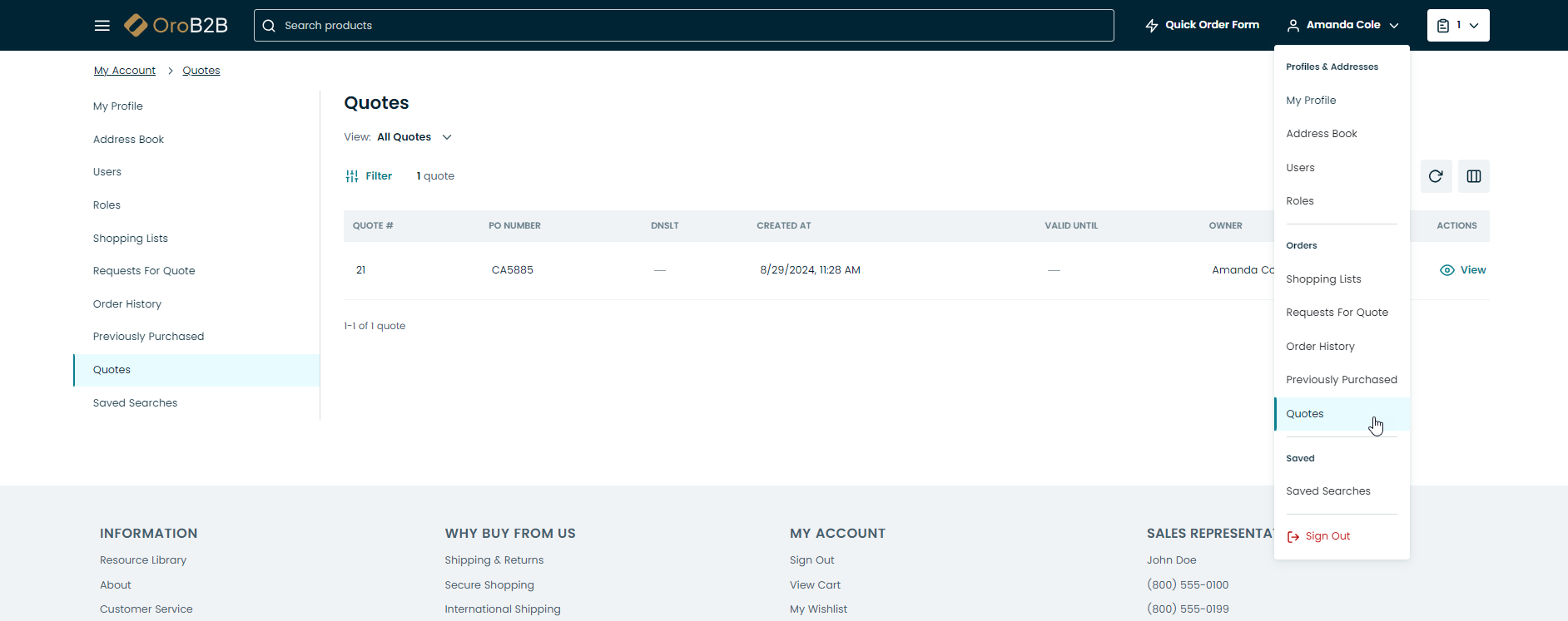 After you submit a quote, it becomes available in the Quotes menu in the user profile.