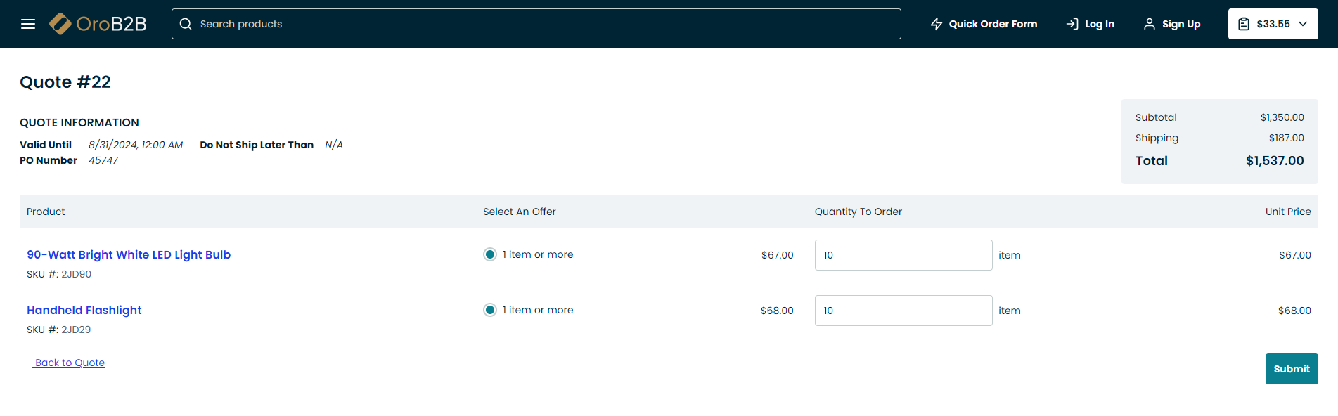 Review the quote and click Accept and Submit to Order to proceed to the next step.