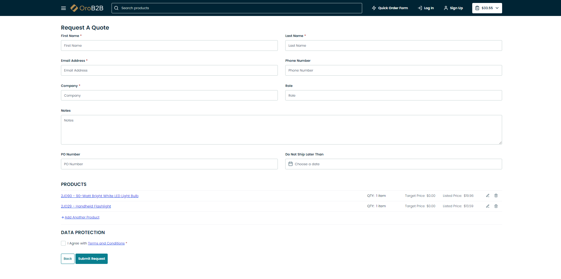 To request a quote in the storefront: