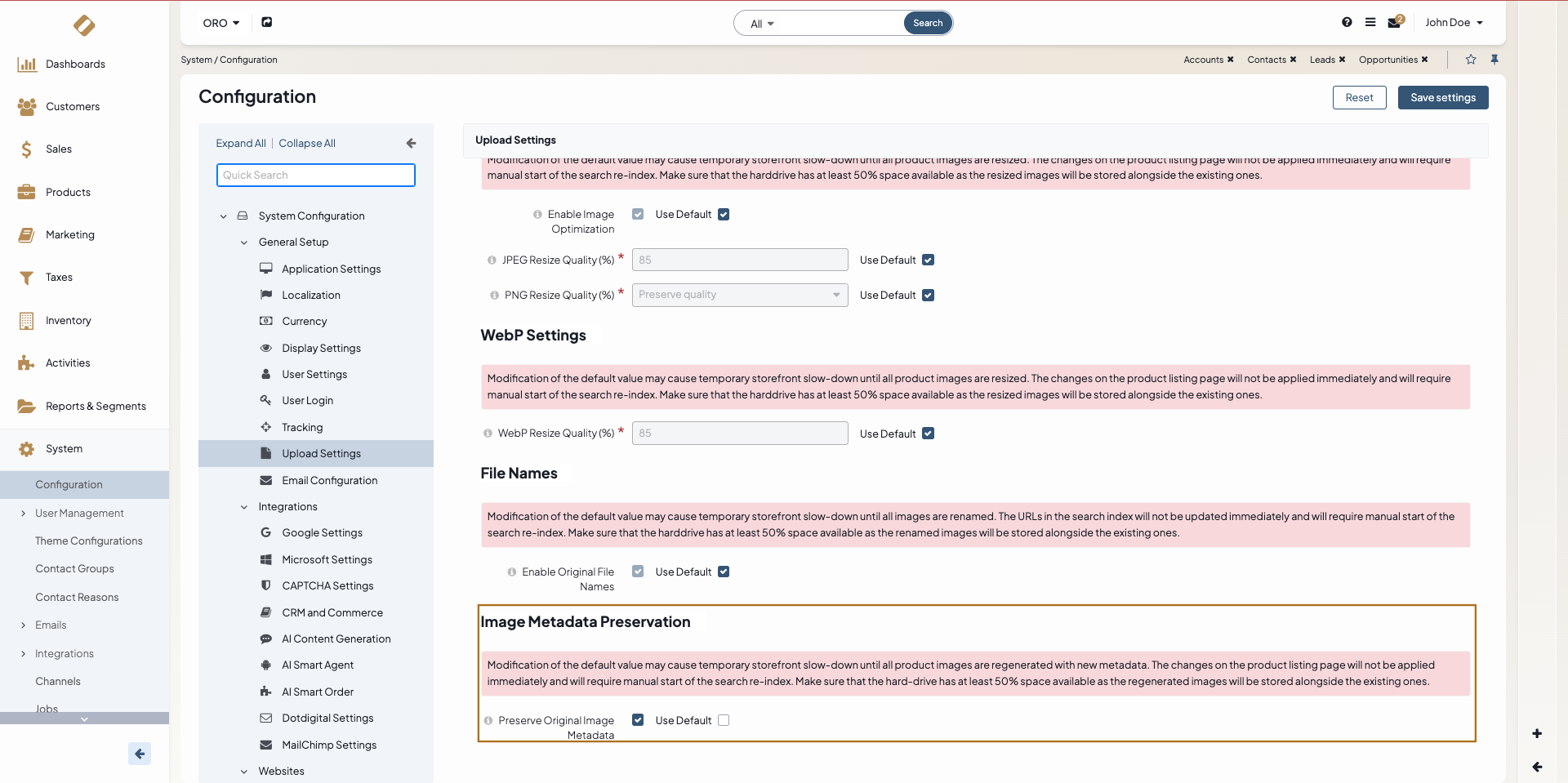 In the Image Metadata Preservation section, you can control whether uploaded images preserve their original metadata.