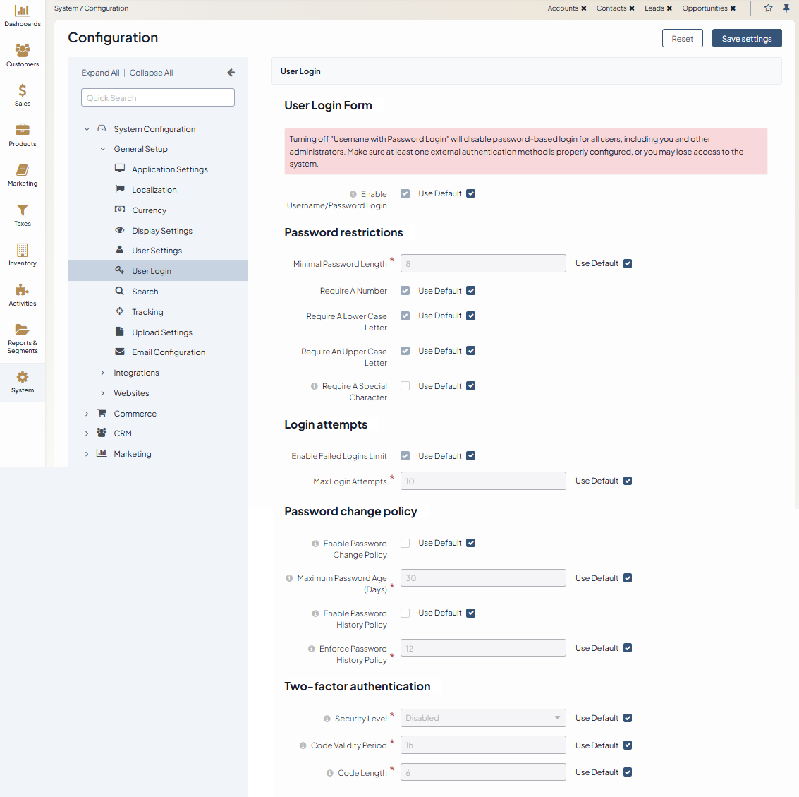 Enable Username/Password Login - When this option is enabled, users can sign in to the back-office with a username and password, and all features related to passwords will be available. If you disable this option, password login will be turned off for all users, including you and administrators. Consequently, all password-related features will also become unavailable.