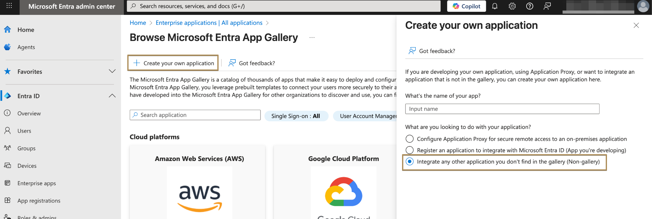 Provide a name for the new app, select the Integrate any other application you don’t find in the gallery option, and then click Add to create an application object. The newly created app will appear in the list of enterprise applications and will open its management page.