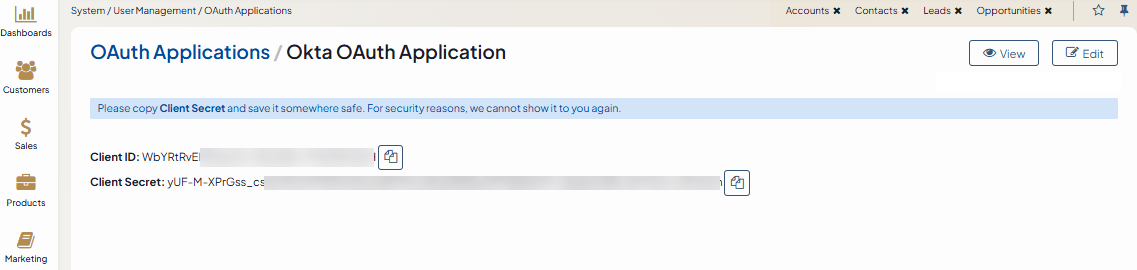 Copied Client ID and Client secret. For security reasons, the Client Secret is displayed only once – immediately after you have created a new application. You cannot view the Client Secret anywhere in the application once you leave a page with the created application information, so make sure you save it somewhere safe so you can access it later.
